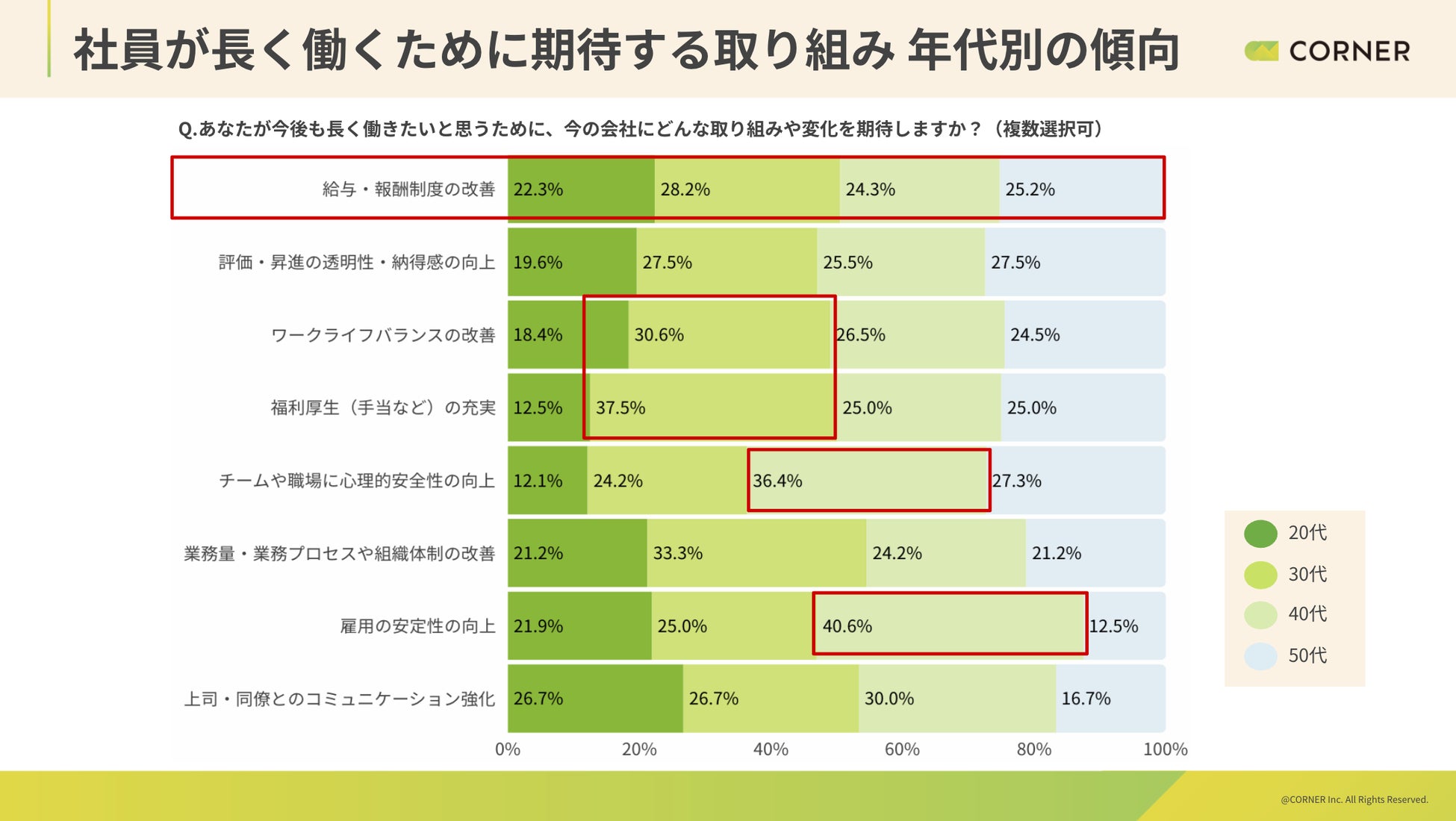 年代別に社員の回答を分析すると、給与・報酬と評価の納得感はすべての年代で均一に選択されていることから最も重視されるニーズといえる。30代は働きやすさ・制度運用面、40代は安心・安定性に関する項目をやや重視する傾向にある。