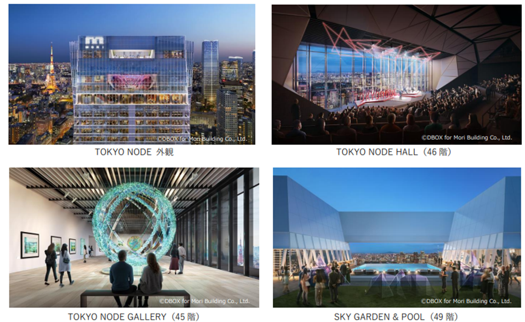 2023 年 10 月 6 日に開業した「虎ノ門ヒルズ ステーションタワー」の最上部に位置する、森ビル株式会社が運営する情報発信拠点「TOKYO NODE」。イベントホール、ギャラリー、レストラン、ルーフトップガーデンなどが複合する、約 10,000 ㎡の新たな情報発信拠点です。 施設内には、ミシュランで星を獲得したシェフによるレストランや、イノベーティブなプレイヤーが集まり共同研究を行う「TOKYO NODE LAB」も併設。NODE=結節点という名のとおり、ビジネス、アート、テクノロジー、エンターテイメントなどあらゆる領域を超えて、新たなものを生み出し、世界に発信していく舞台となります。