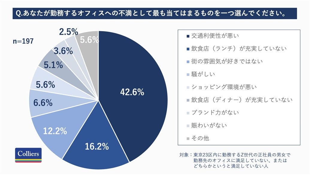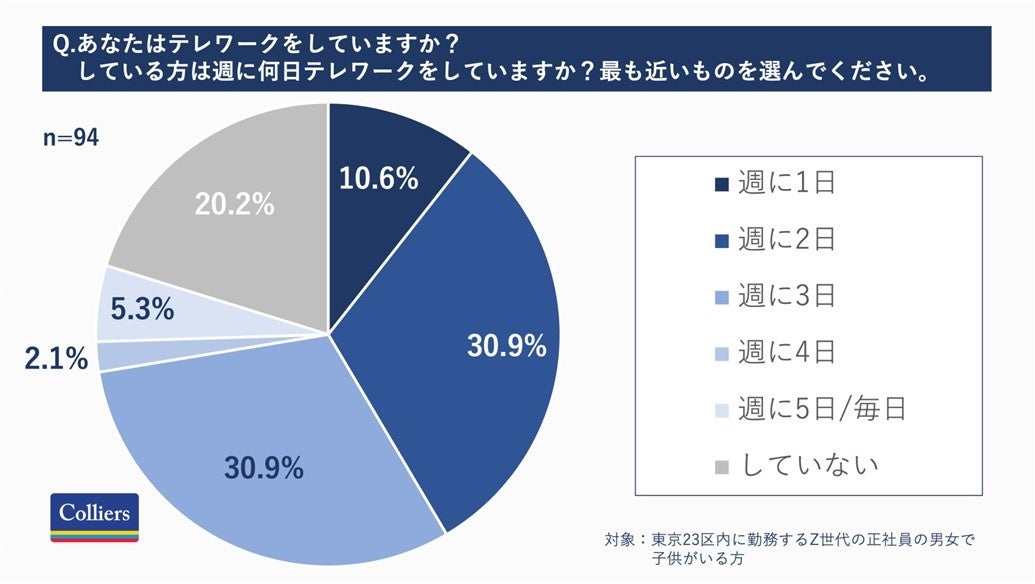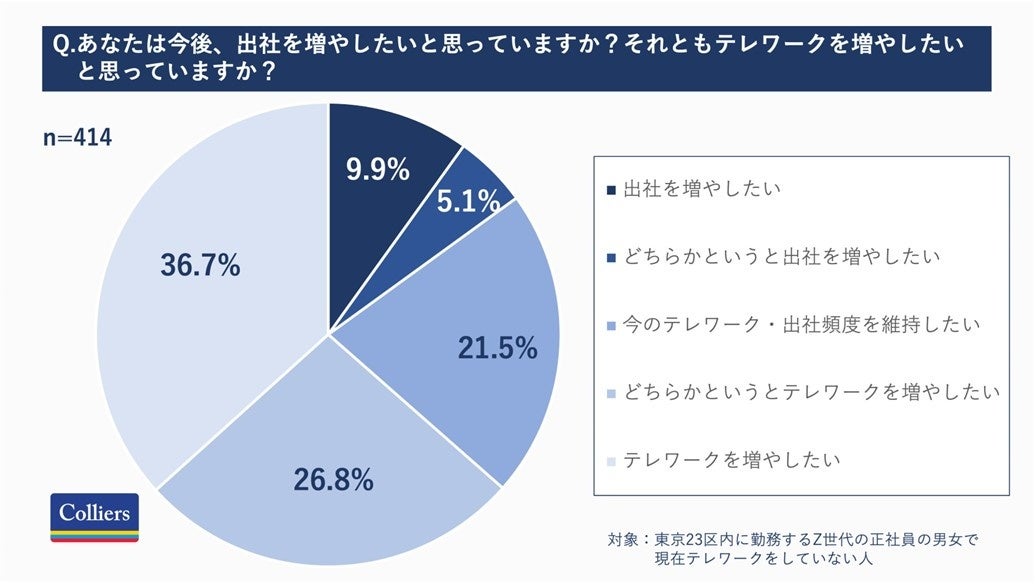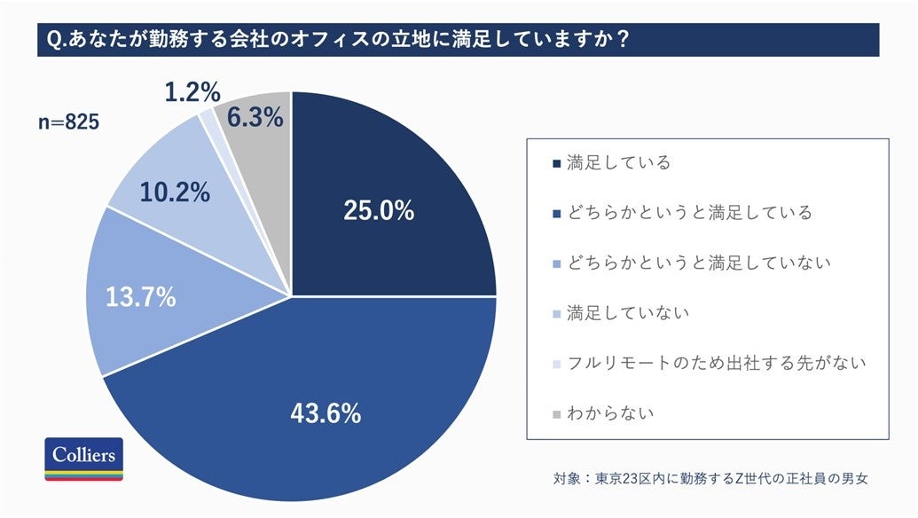 大手総合不動産コンサルティングサービス・投資運用会社であるコリアーズ・インターナショナ ル・ジャパン株式会社(代表:小笠原 行洋、本社:東京都千代田区、NASDAQ および TSX: CIGI、以下コリアーズ・ジャパン)は、2023 年 10 月 12 日(木)に「東京 23 区内に正社員として 勤務する Z 世代(18 歳〜27 歳)」の男女 825 名に、働き方に関する意識調査を実施しました。
