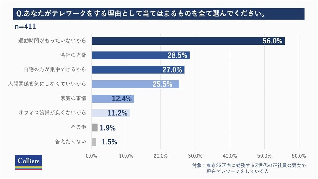 コロナ禍が落ち着いた現在も Z 世代はテレワーク志向でも半数はテレワーク未実施、主な理由は「会社の方針」テレワークする主な理由は「通勤時間がもったいない」