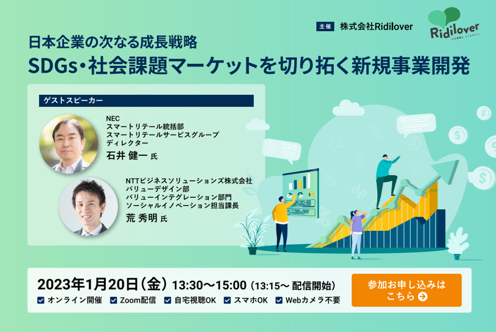 株式会社Ridilover(以下、リディラバ)は、日経BP総合研究所の協力を得て、【新規事業✕社会課題解決】に取り組む企業担当者に向けた無料オンラインセミナーを開催します。