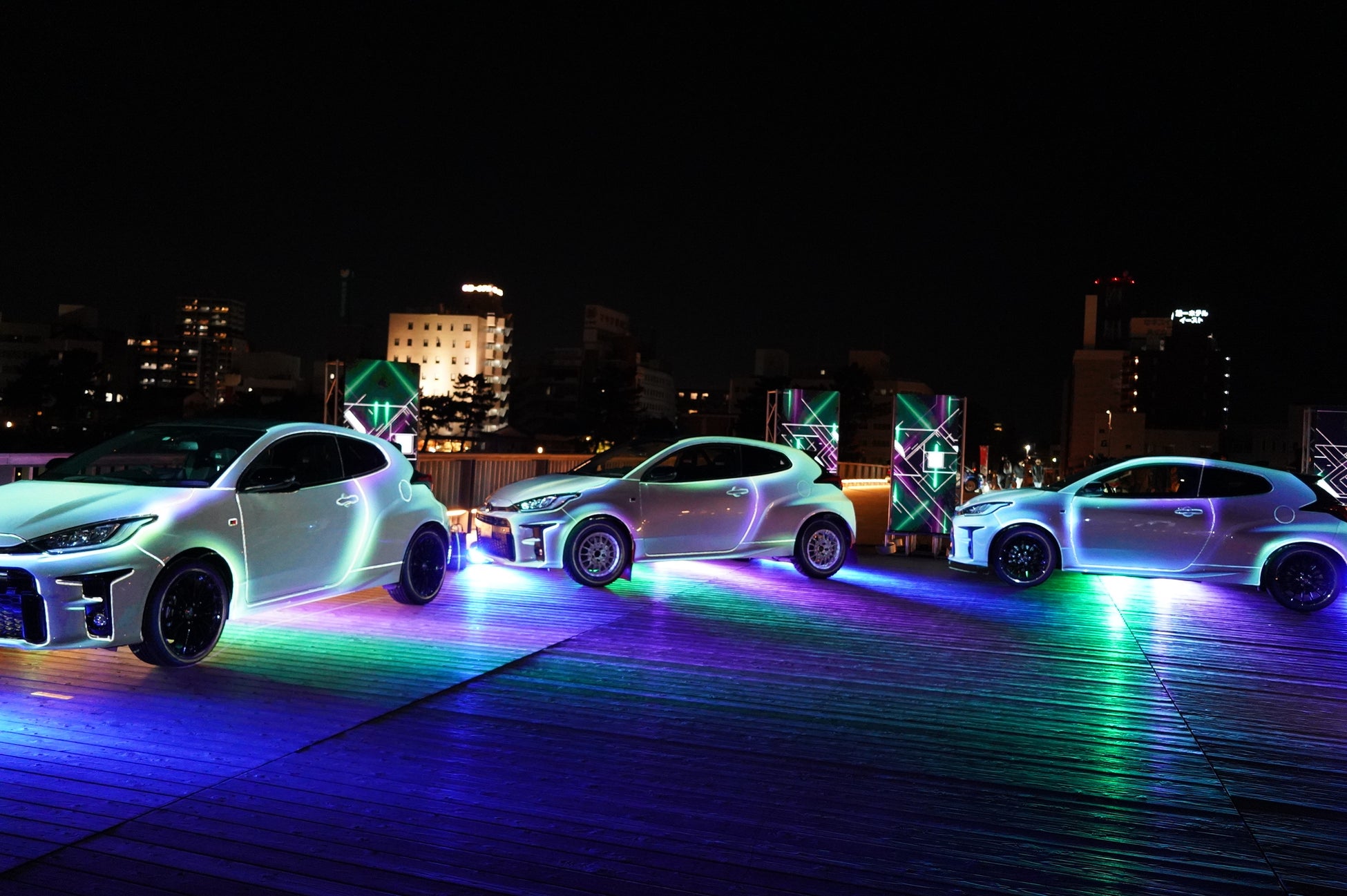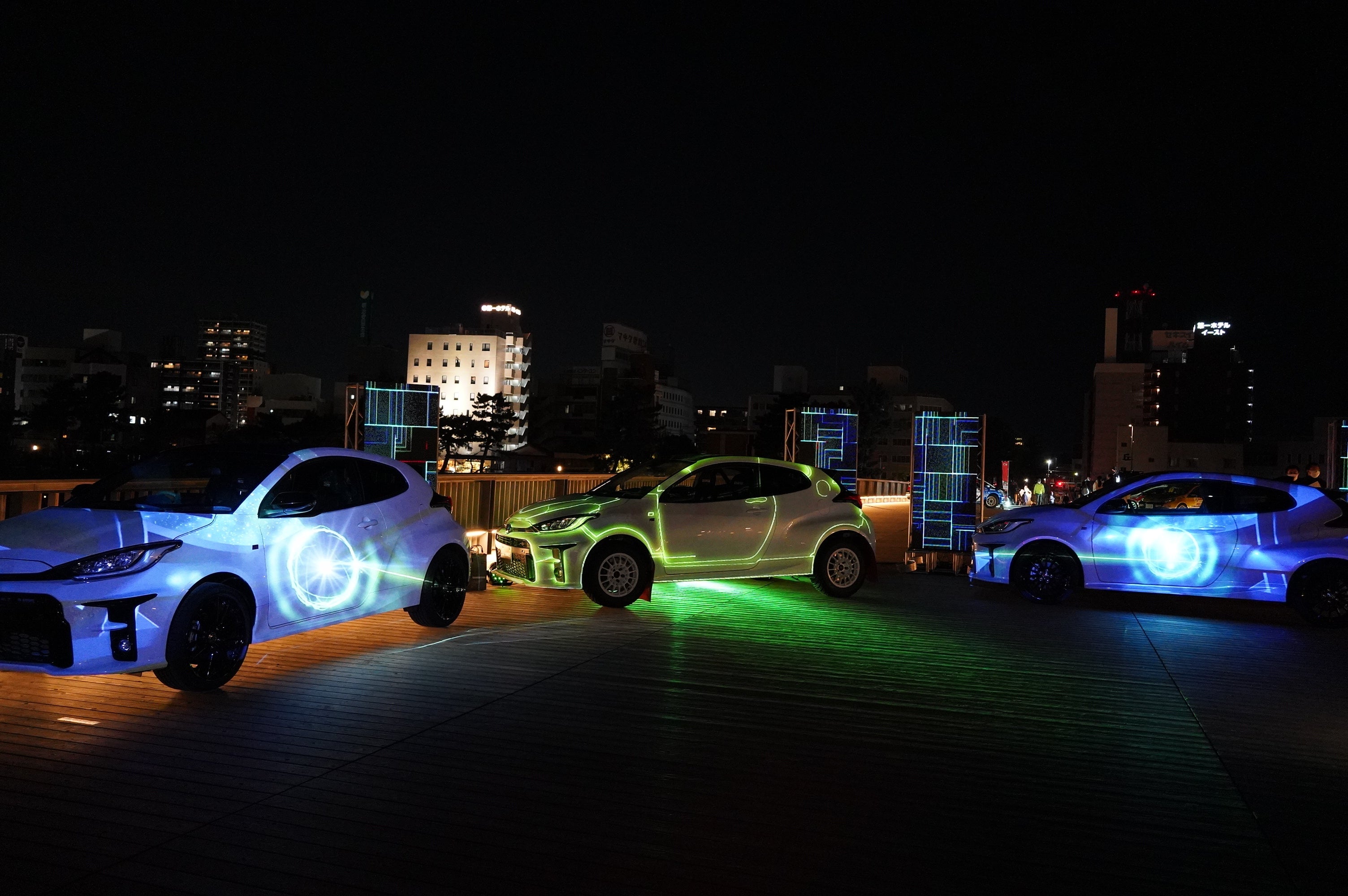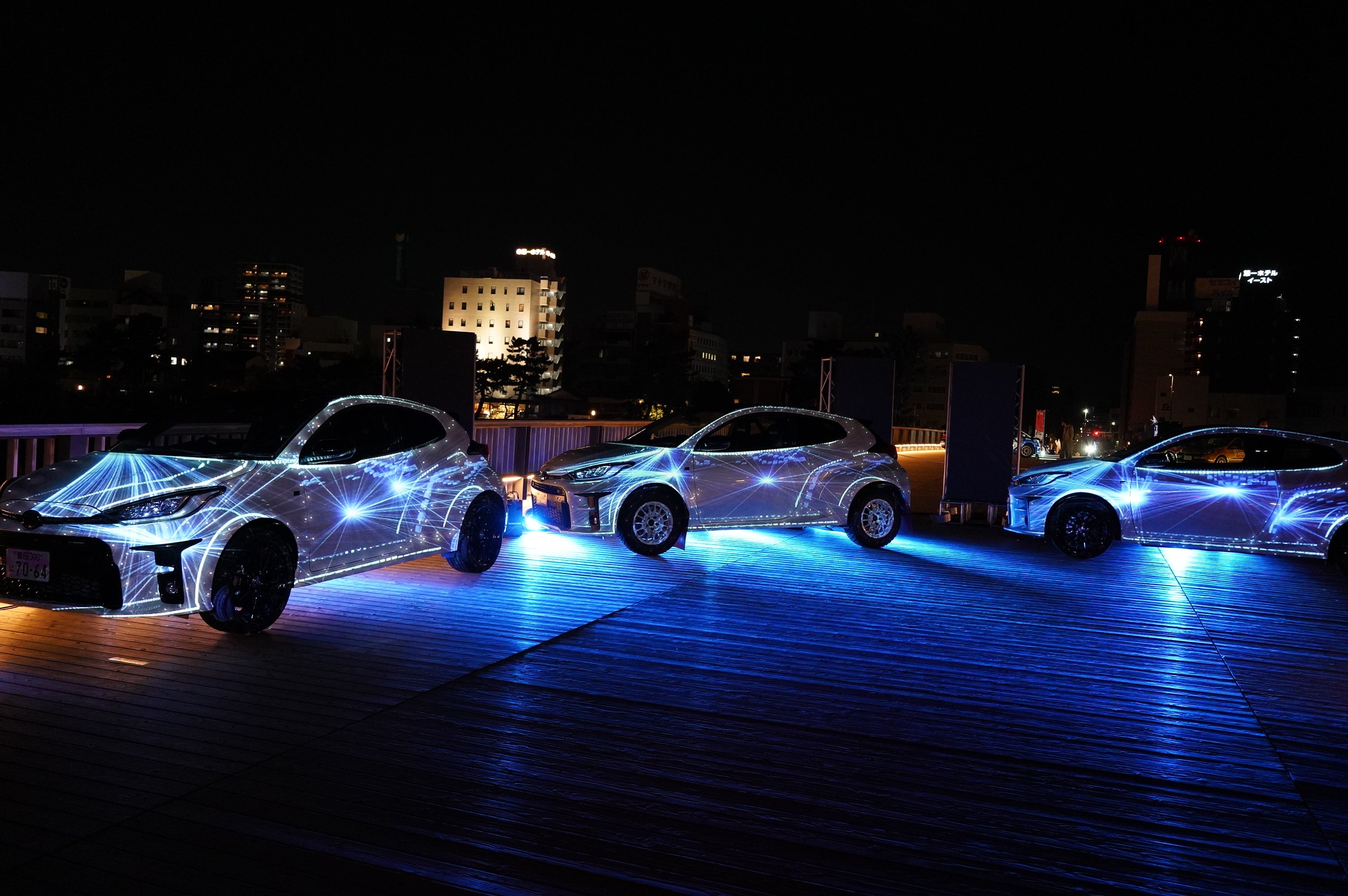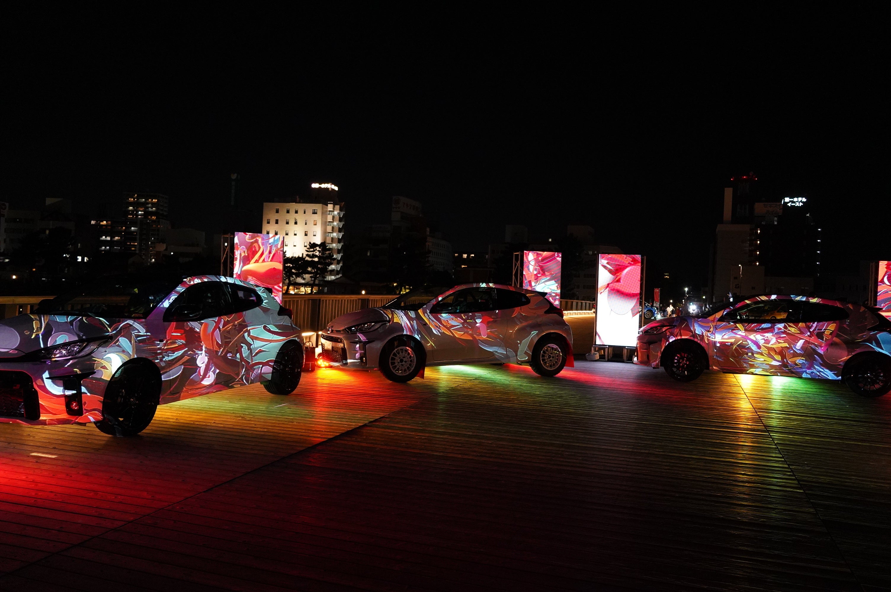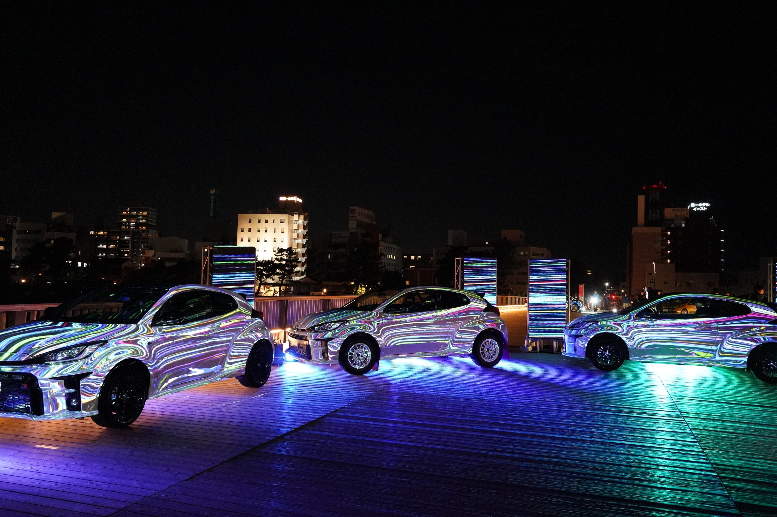 サイバー空間を疾走するようなデジタルアートコンテンツなどのプロジェクションマッピング映像を「トヨタ GRヤリス」に投影。