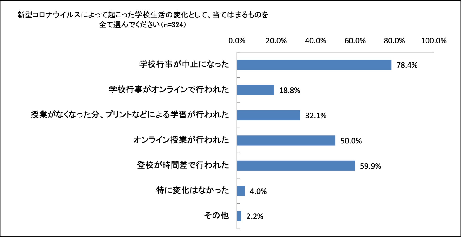 ・受験生の78.4%が学校行事の中止を経験、また半数の生徒がオンライン授業を経験