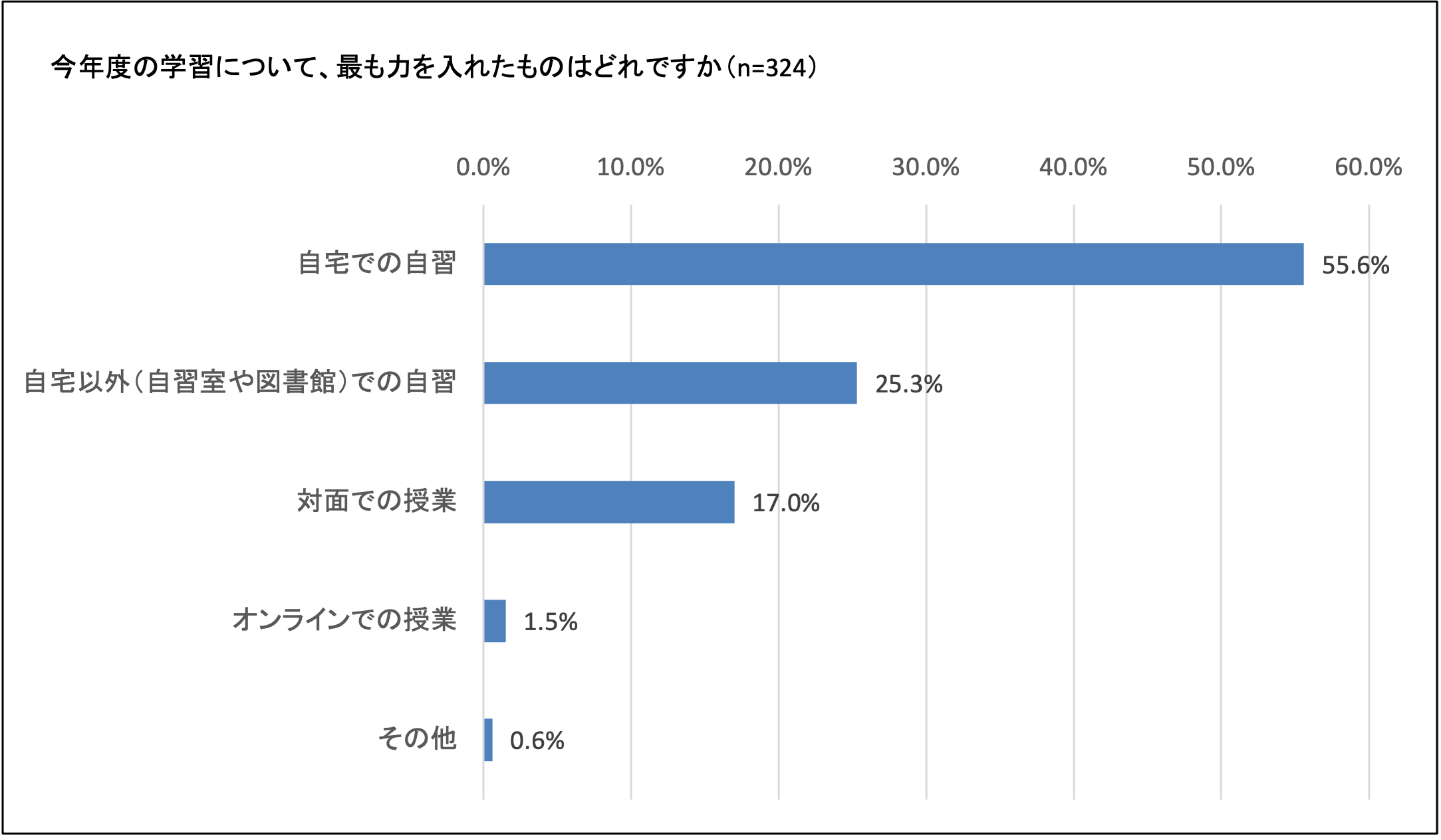 このような現状の中、受験生の80.9%が「自習」を学習の中心としており、55.6%は自宅での自習を中心としていました。新型コロナウイルスの影響があり、自習、特に自宅での自習が増加したと考えられます。