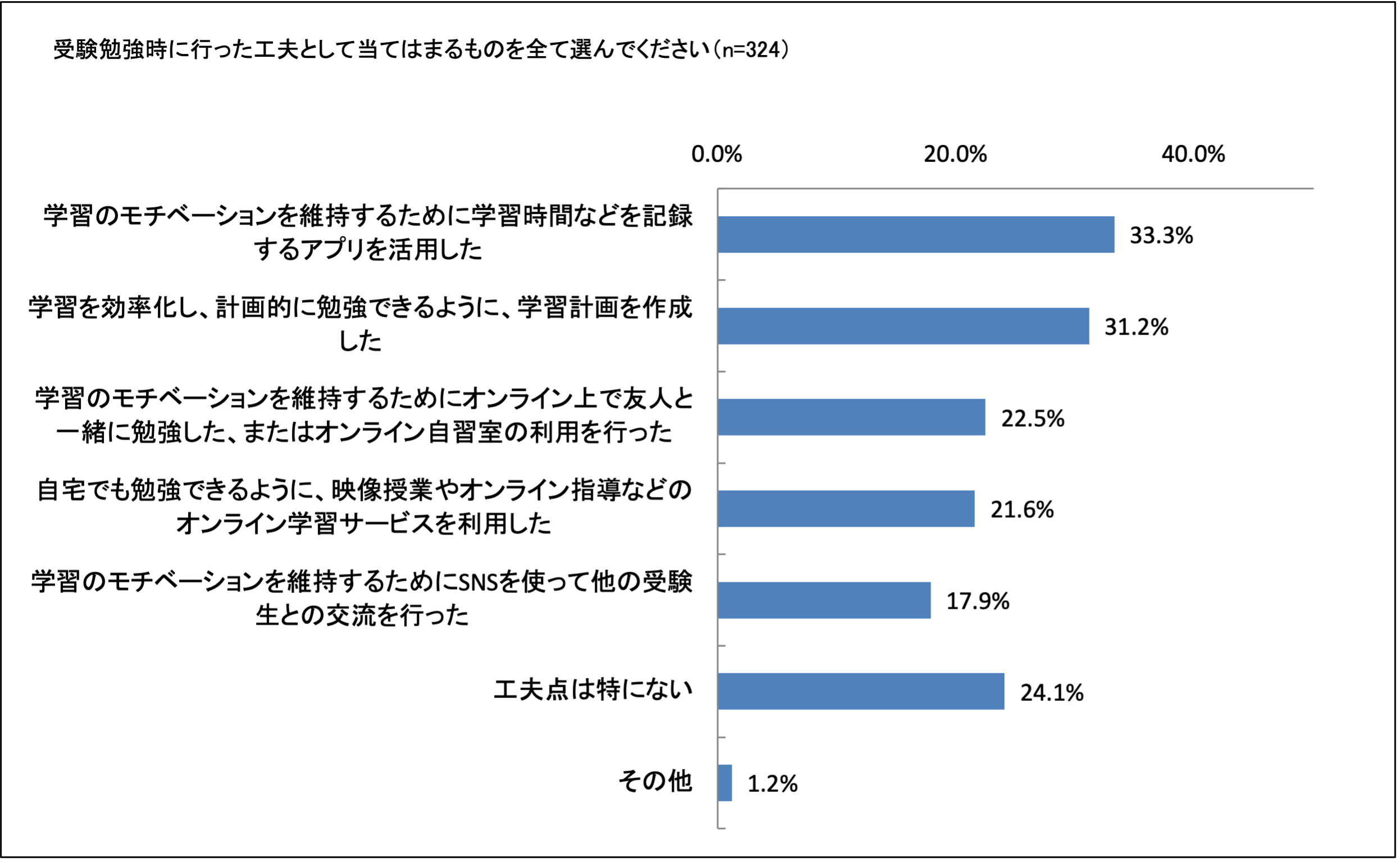 受験勉強時に行った工夫としては、33.3%の生徒が学習時間記録アプリを利用、31.2%の生徒が学習計画を作成したと回答しており、自習を効率的に行う工夫が多く行われています。また、22.5%の生徒がオンラインで友人などと繋がりながらの学習、17.9%がSNSで他の受験生と交流を行ったと回答しており、友人との直接の交流が減る中でも新たな形での学習のモチベーション維持が広がっていると言えます。