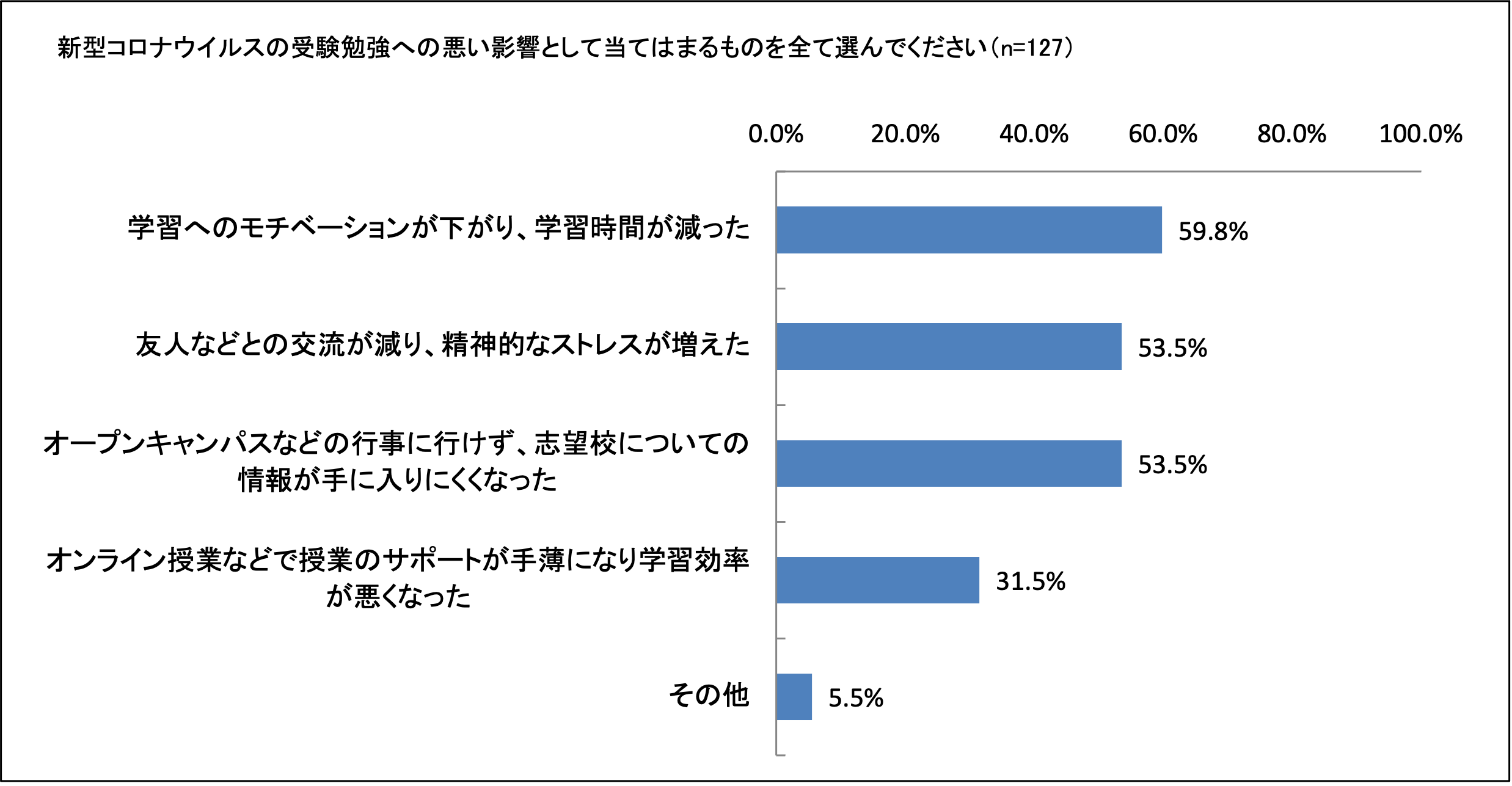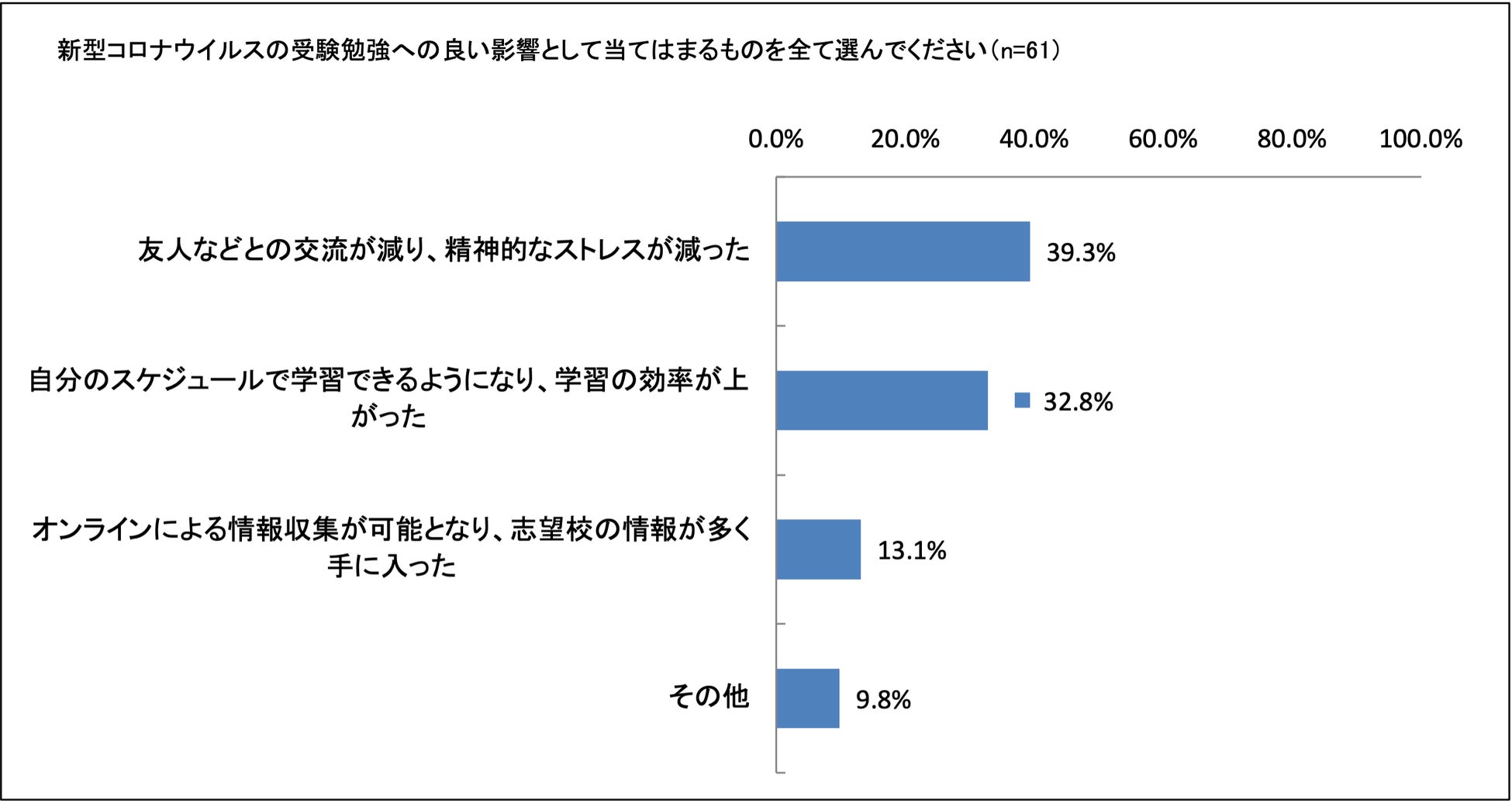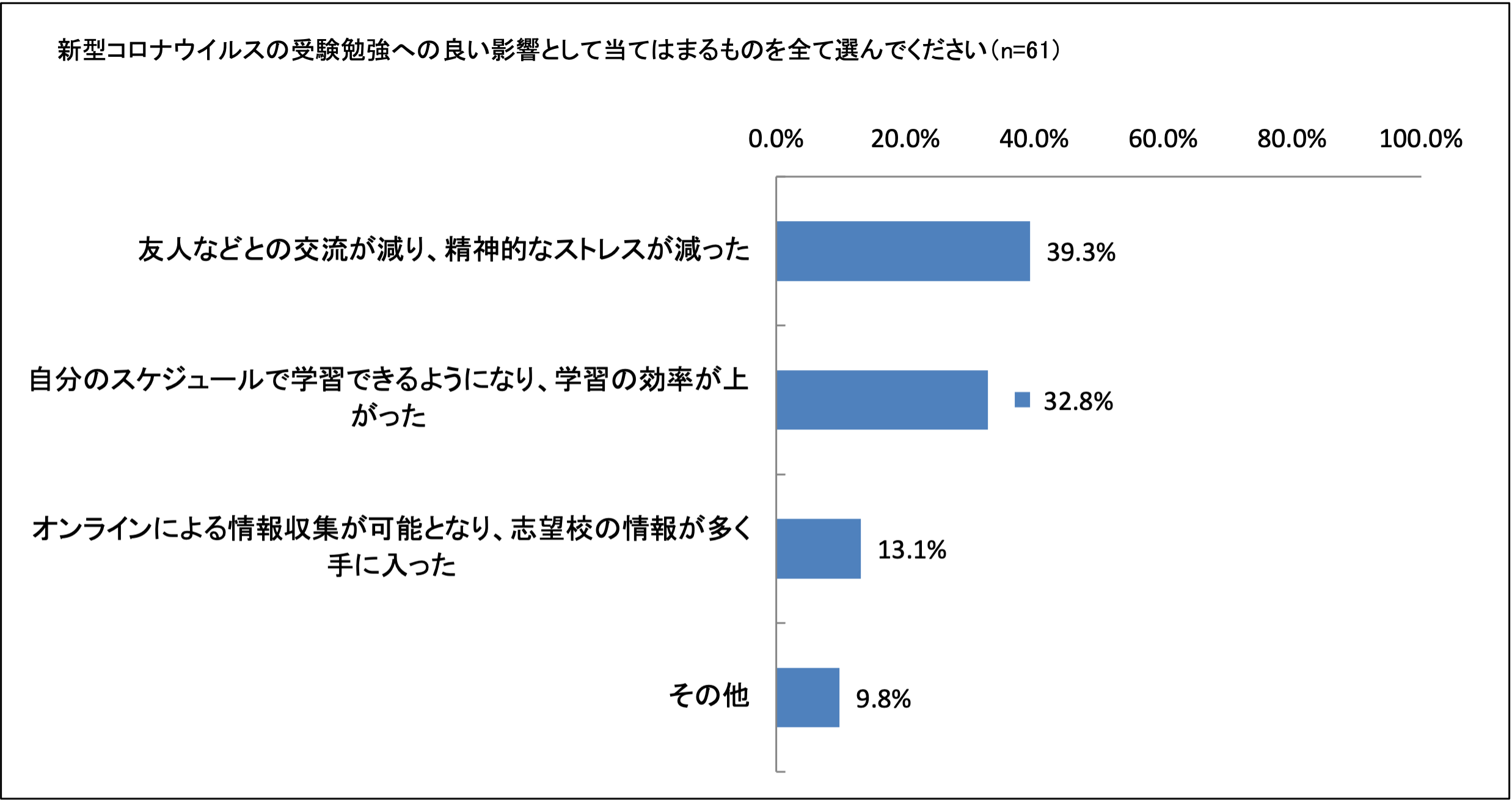 新型コロナウイルスから受けた影響については、受験生の約4割が悪い影響を受けたと回答しました。悪い影響の内容としては、「モチベーションの維持ができず学習時間が減少したこと」が59.5%、「友人との交流の減少によるストレスの増加」53.5%と精神的な影響が多く、特に全体の約23%が新型コロナウイルスによって学習時間が減少したという結果となりました。