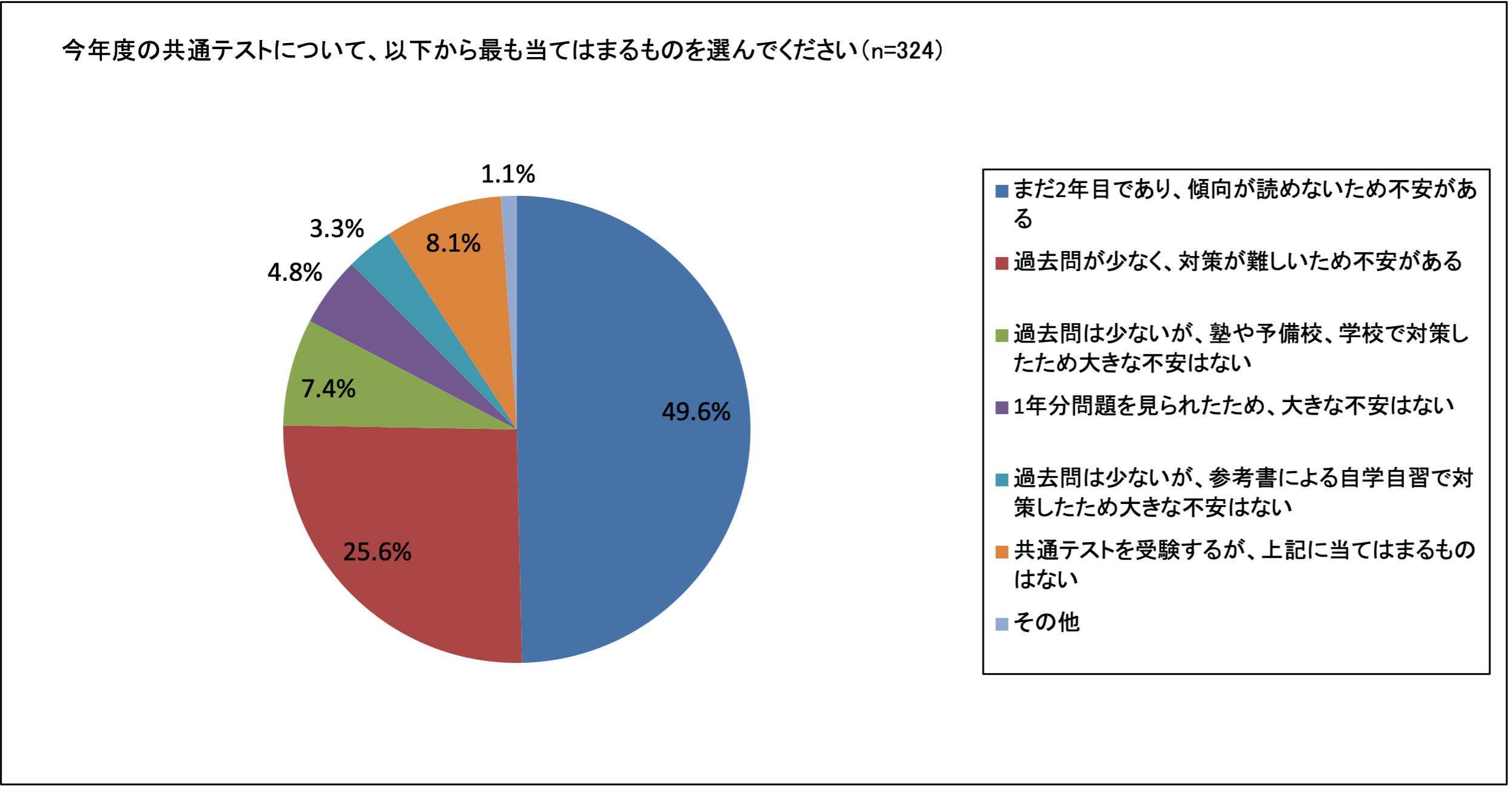 今年度の共通テストに関しては72.5%が「不安がある」と答えており、傾向が掴めないことや過去問が少ないことがその要因になっていると言えます。