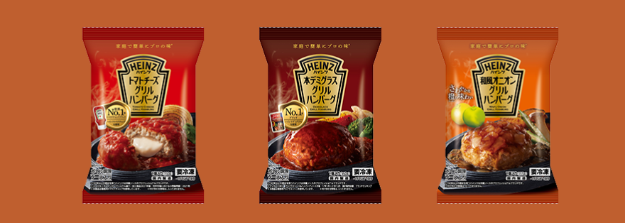 ハインツの冷凍ハンバーグシリーズは、レストランのシェフが作るようにグリルした香ばしくジューシーなパテを、150年以上の歴史を持つ『ハインツ』のオリジナルソースで仕上げたので、家庭で簡単にプロの味をお楽しみいただけます。