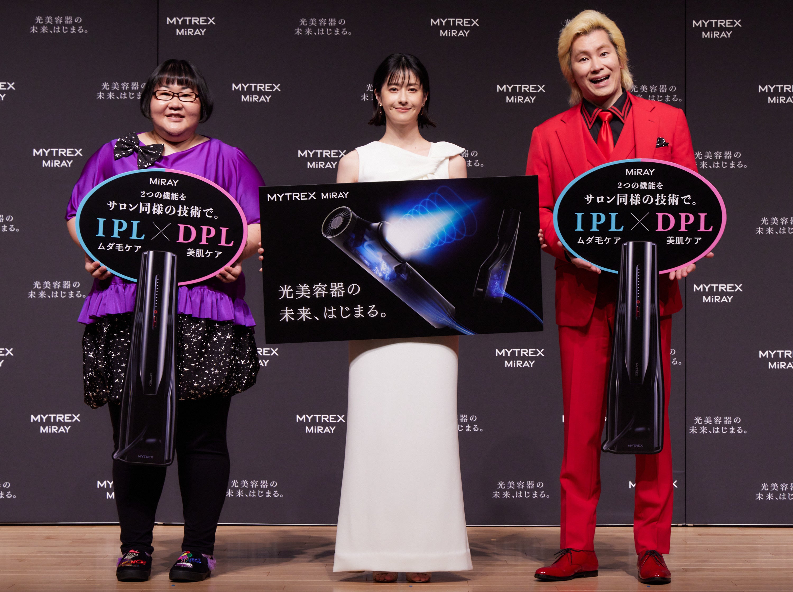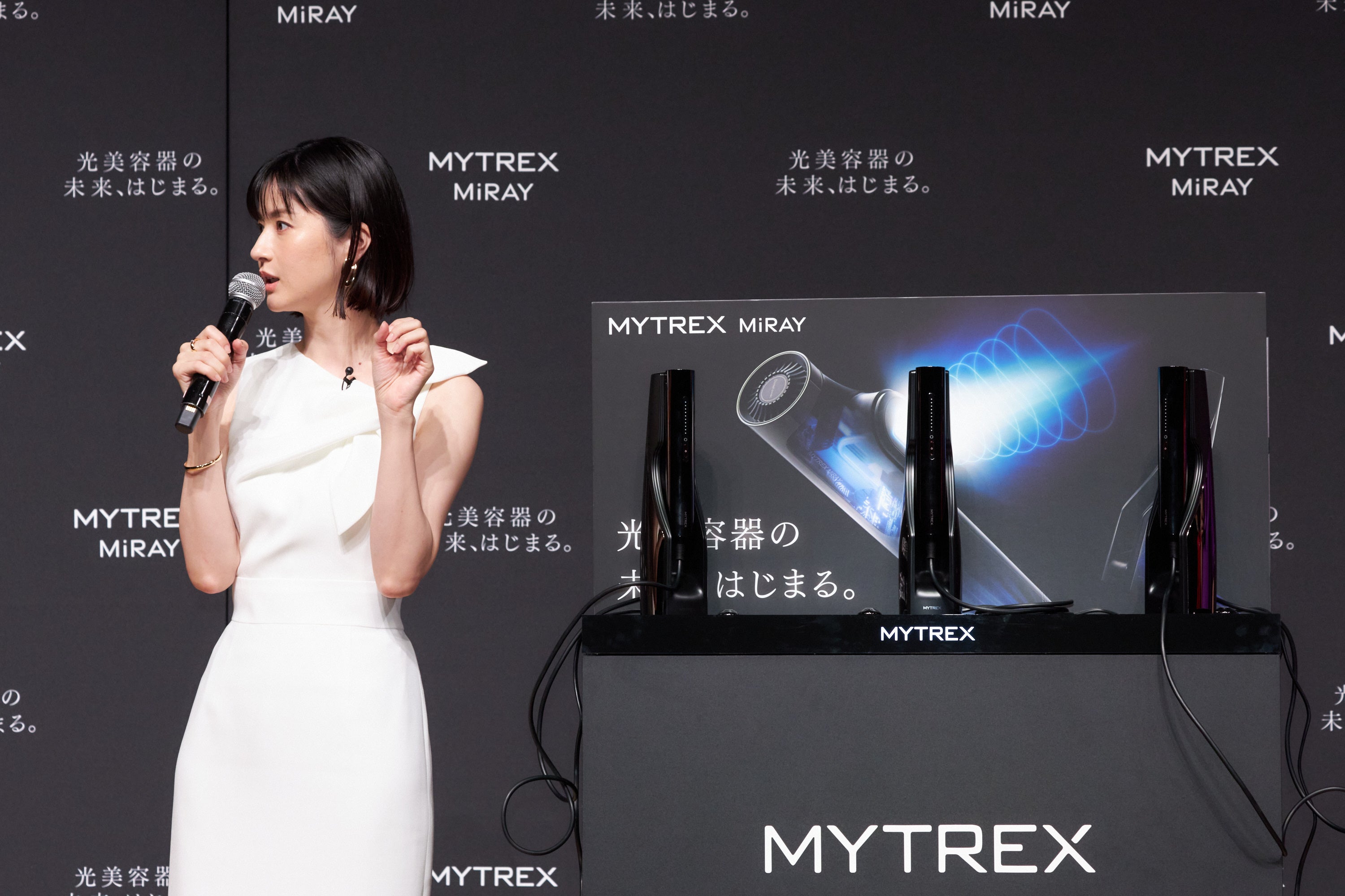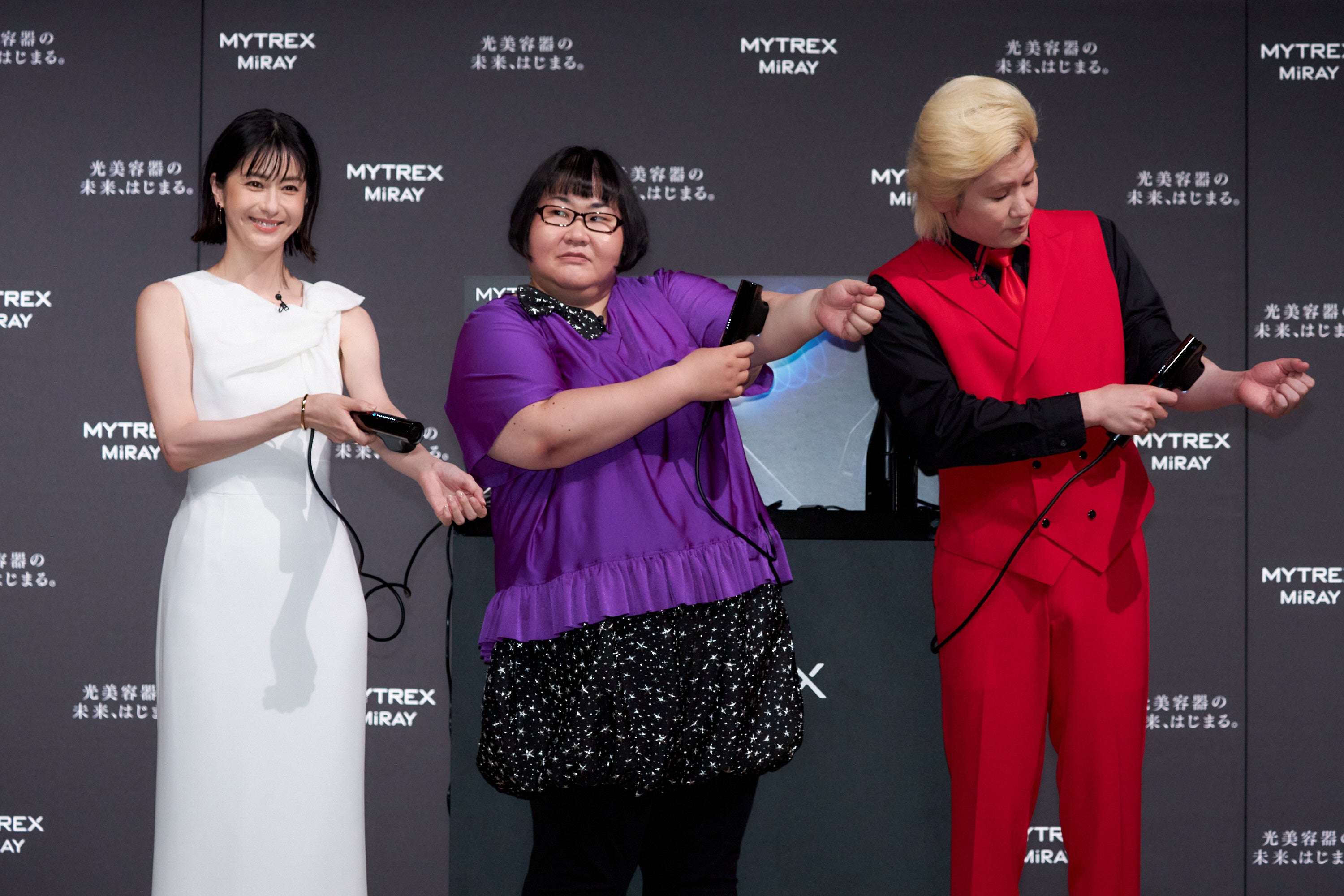 また、IPLとDPLの2つが叶う「MYTREX MiRAY」にかけてに二刀流でチャレンジしたいことについて伺うと、松本さんは「見た目のケアもしながら、アクションにも挑戦したいので美とアクションを両立したいです。」と意気込みました。カズレーザーさん「まずは何か一つ極められるものを見つけたいですね。」、安藤さんは「大きくて量が多い料理を作ることに最近はまっているので、食べて痩せて筋肉をつけるの三刀流にチャレンジします。」と意気込みました。