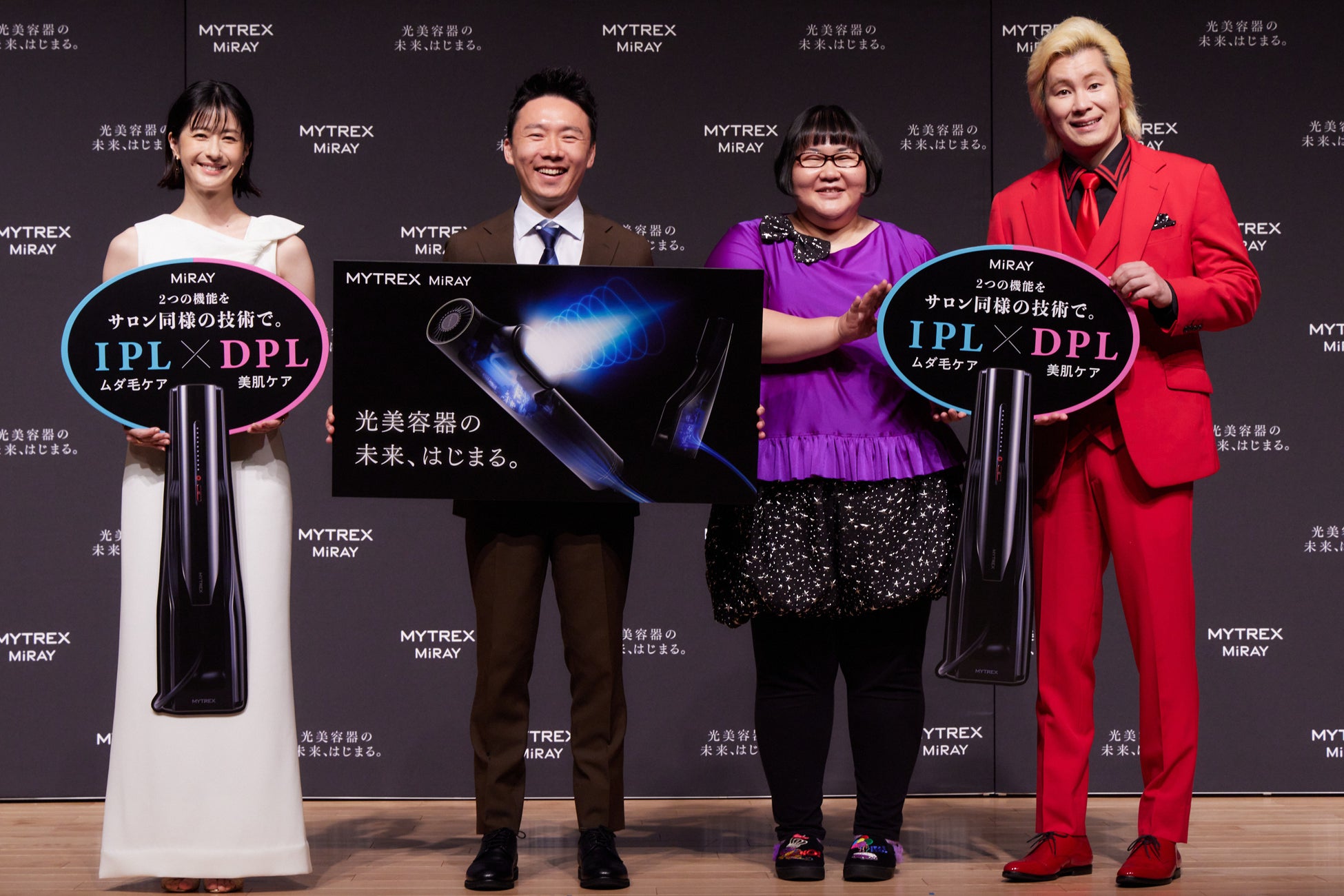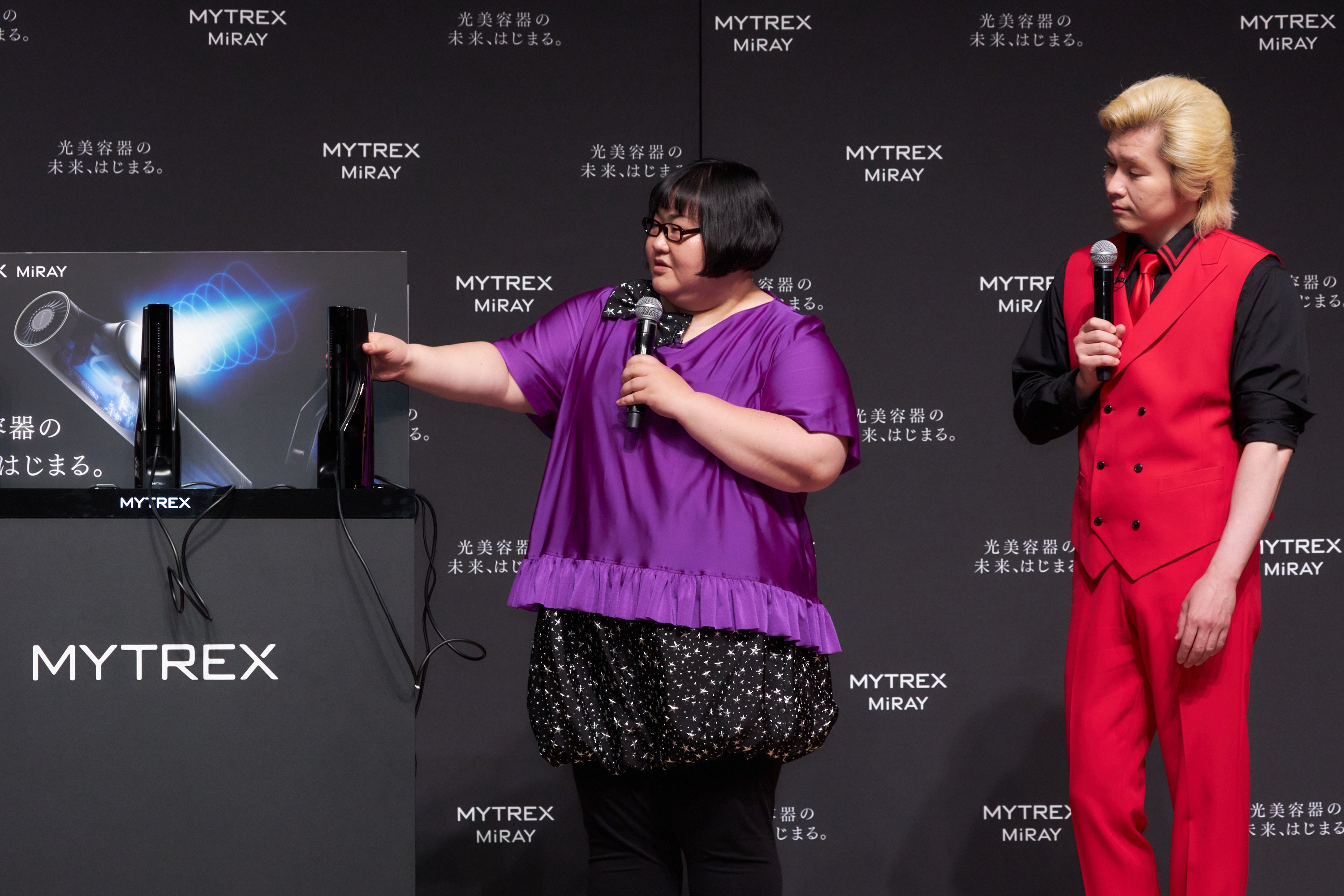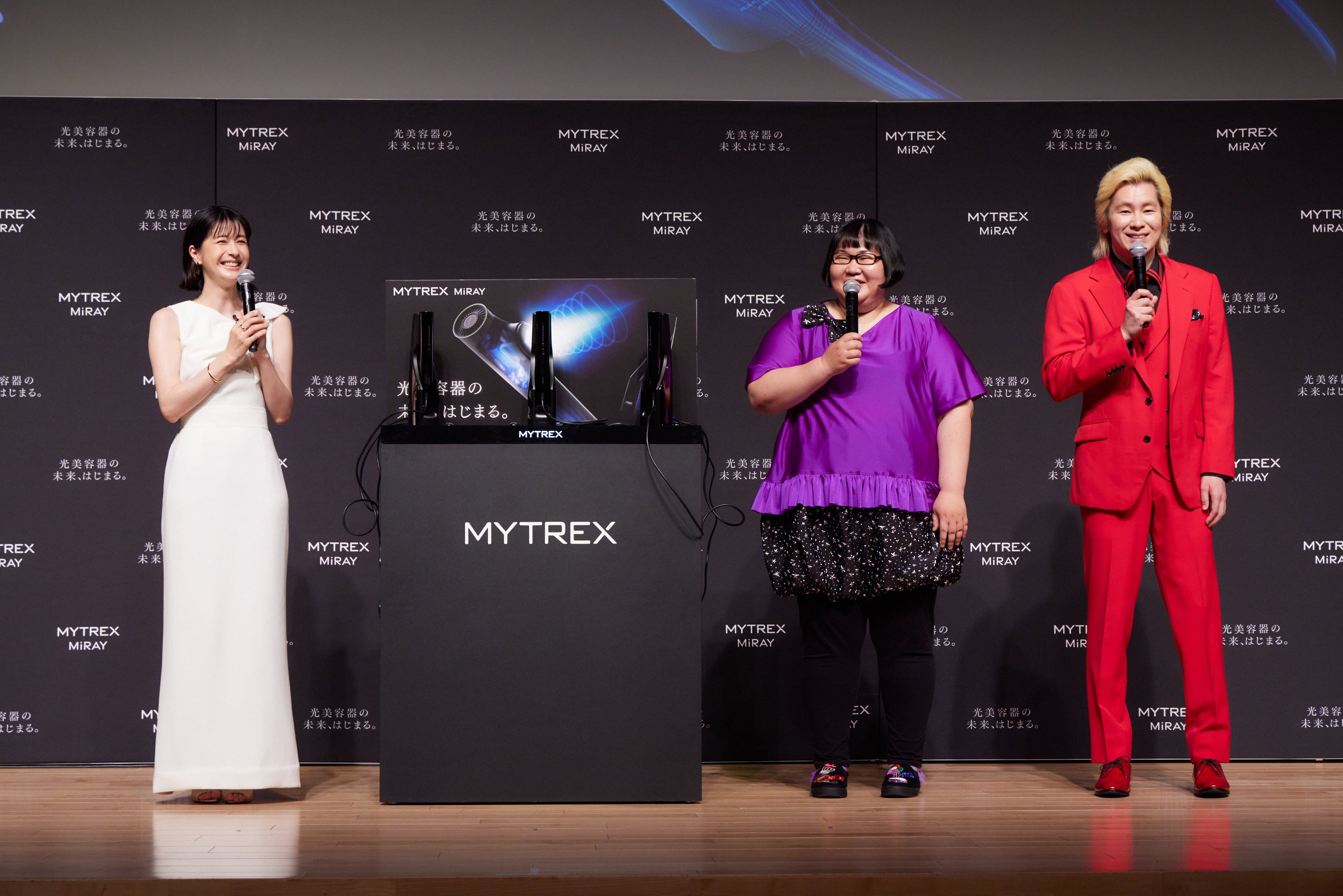 また、IPLとDPLの2つが叶う「MYTREX MiRAY」にかけてに二刀流でチャレンジしたいことについて伺うと、松本さんは「見た目のケアもしながら、アクションにも挑戦したいので美とアクションを両立したいです。」と意気込みました。カズレーザーさん「まずは何か一つ極められるものを見つけたいですね。」、安藤さんは「大きくて量が多い料理を作ることに最近はまっているので、食べて痩せて筋肉をつけるの三刀流にチャレンジします。」と意気込みました。