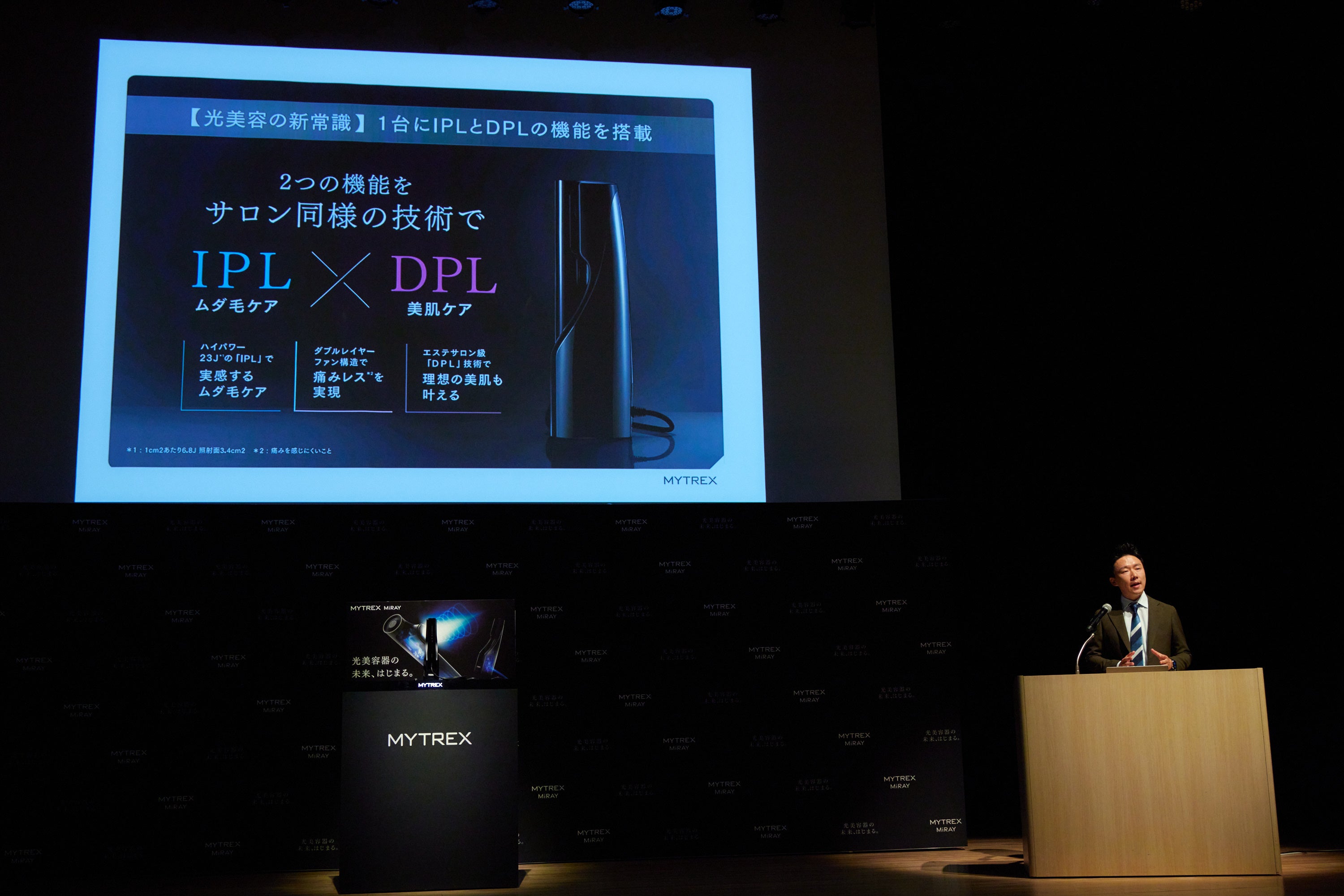 イベントでは、株式会社創通メディカル 代表取締役 薛 明鶴が登壇、MYTREXブランドおよび新製品「MYTREX MiRAY」について説明を行いました。薛は「MYTREX MiRAYは、使い勝手とハイパワーの両立をかなえる光美容器として自信を持って発表します。」と話し、「MiRAYの4つのポイントとして、(1)家庭用光美容器の中で最高のパワーを実現、(2)「強力冷却」で痛みを徹底軽減させ肌ダメージを限りなく抑える(3) 持ち手を軽量化し自宅での快適ケアを実現、(4)史上初のIPLとDPL光技術を搭載しています。」と製品を説明しました。