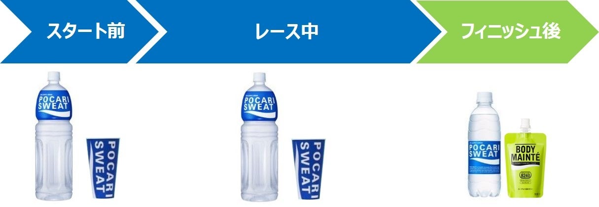 完走や記録更新を目指すランナーをサポートするため、エビデンスに基づき開発したニュートラシューティカルズ関連事業製品を提供します。スタート前とコース上の給水所では失った水分・電解質を素早く補給する「ポカリスエット」、フィニッシュ後にはポカリスエットに加え、体調管理とリカバリーに役立つ「ボディメンテ」を配布します。