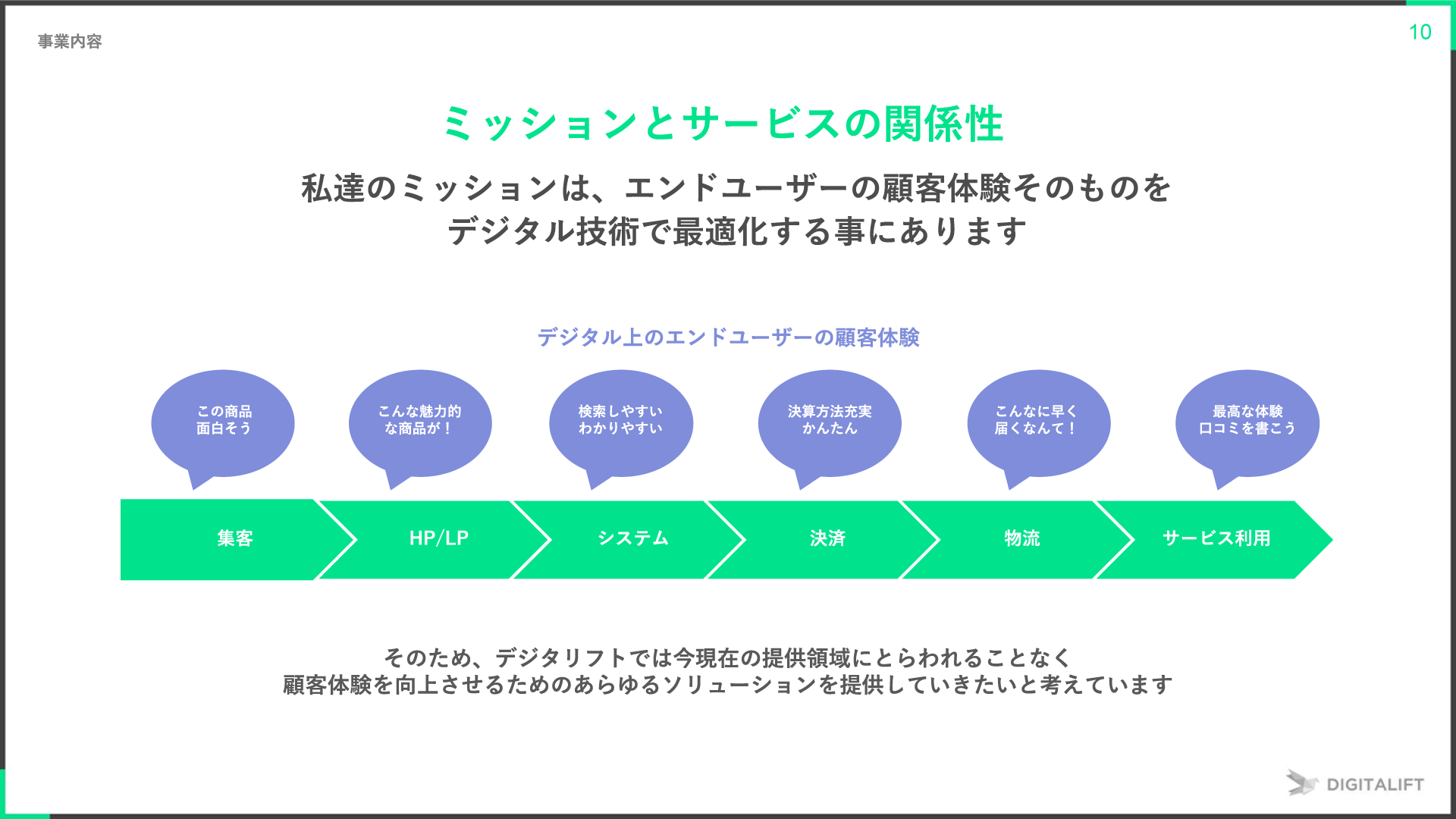 デジタリフトは、「カスタマーの意思決定を円滑に」をビジョンとして掲げ、「User Experienceをデジタル技術で最適化する」事をミッションとしています。