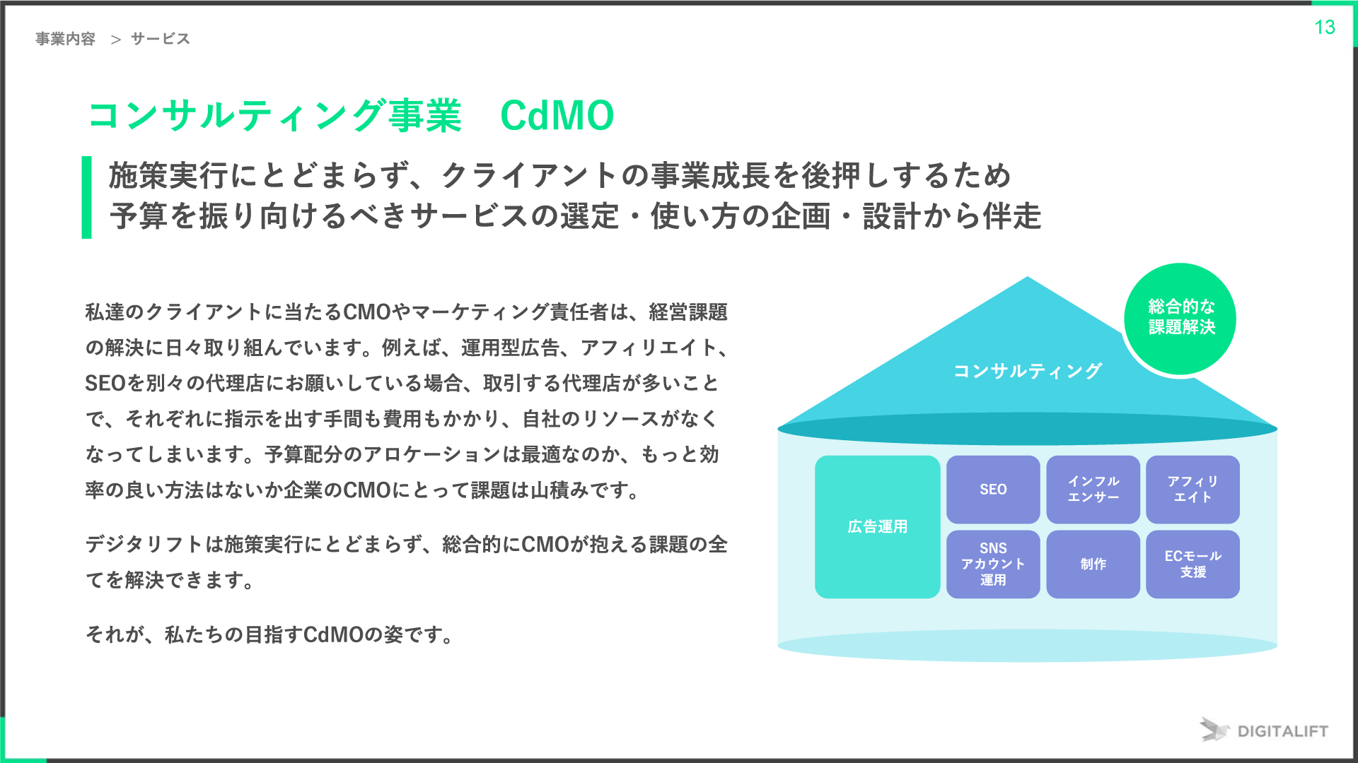 クライアントのCdMO(チーフ・デジタル・マーケティング・オフィサー)として、ソリューションの提供を行うスペシャリスト集団を目指します。