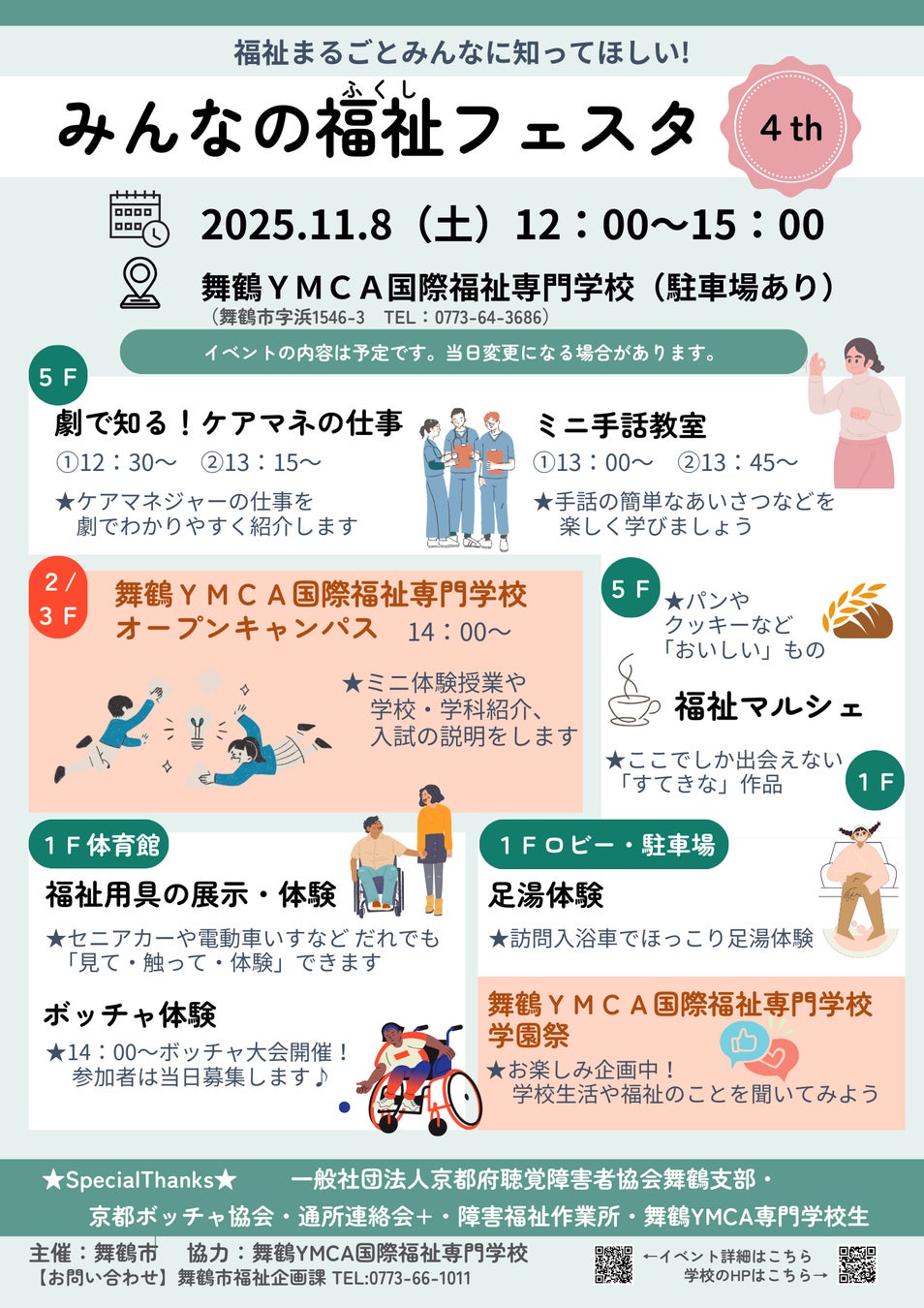 舞鶴市は、令和7年11月8日(土)に舞鶴YMCA国際福祉専門学校にて「みんなの福祉フェスタ2025」を開催します。 福祉を身近に感じ、福祉を支える方々と来場者が理解と交流を深めることを目的とした体験型イベントです。