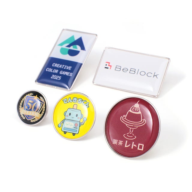 色や形状にこだわりたい方向けのピンバッジまで幅広く取り揃えています