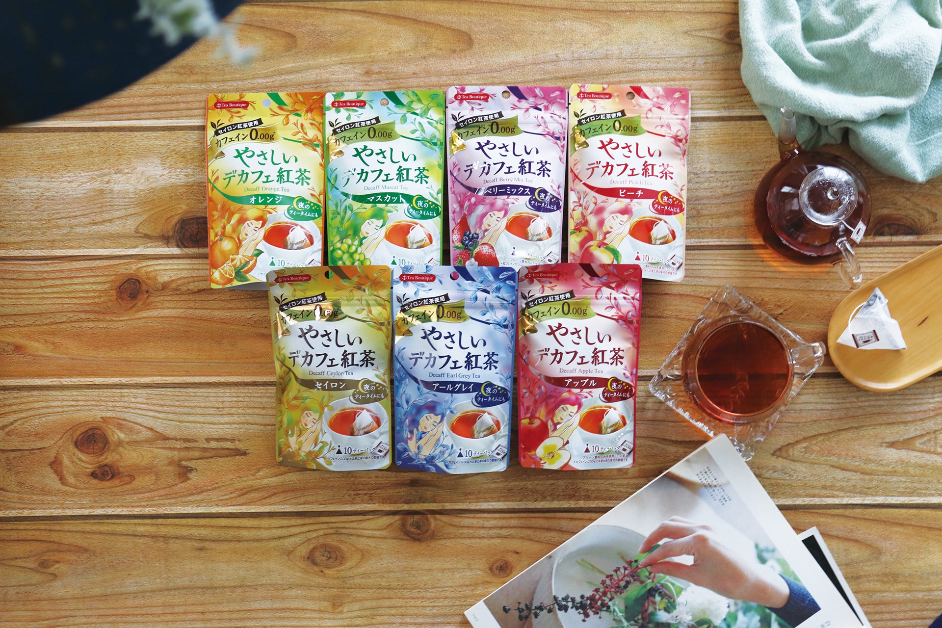 紅茶、和のお茶、ジャスミン茶、水出し紅茶と、「やさしいデカフェ」シリーズは飲み飽きないたくさんの商品を展開しています。その日の気分で選んでお楽しみください。