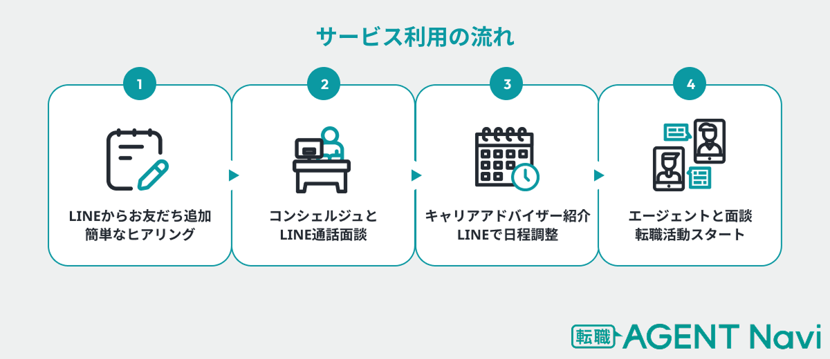 「転職AGENT Navi」は、求職者とキャリアアドバイザーを繋ぐマッチングサービスです。転職活動に精通した経験豊富な「転職AGENT Navi」のコンシェルジュが求職者とLINE通話で面談を行い、求職者のニーズに合わせてキャリアアドバイザーを複数名紹介。その後、マッチングしたキャリアアドバイザーと転職活動がスタートします。