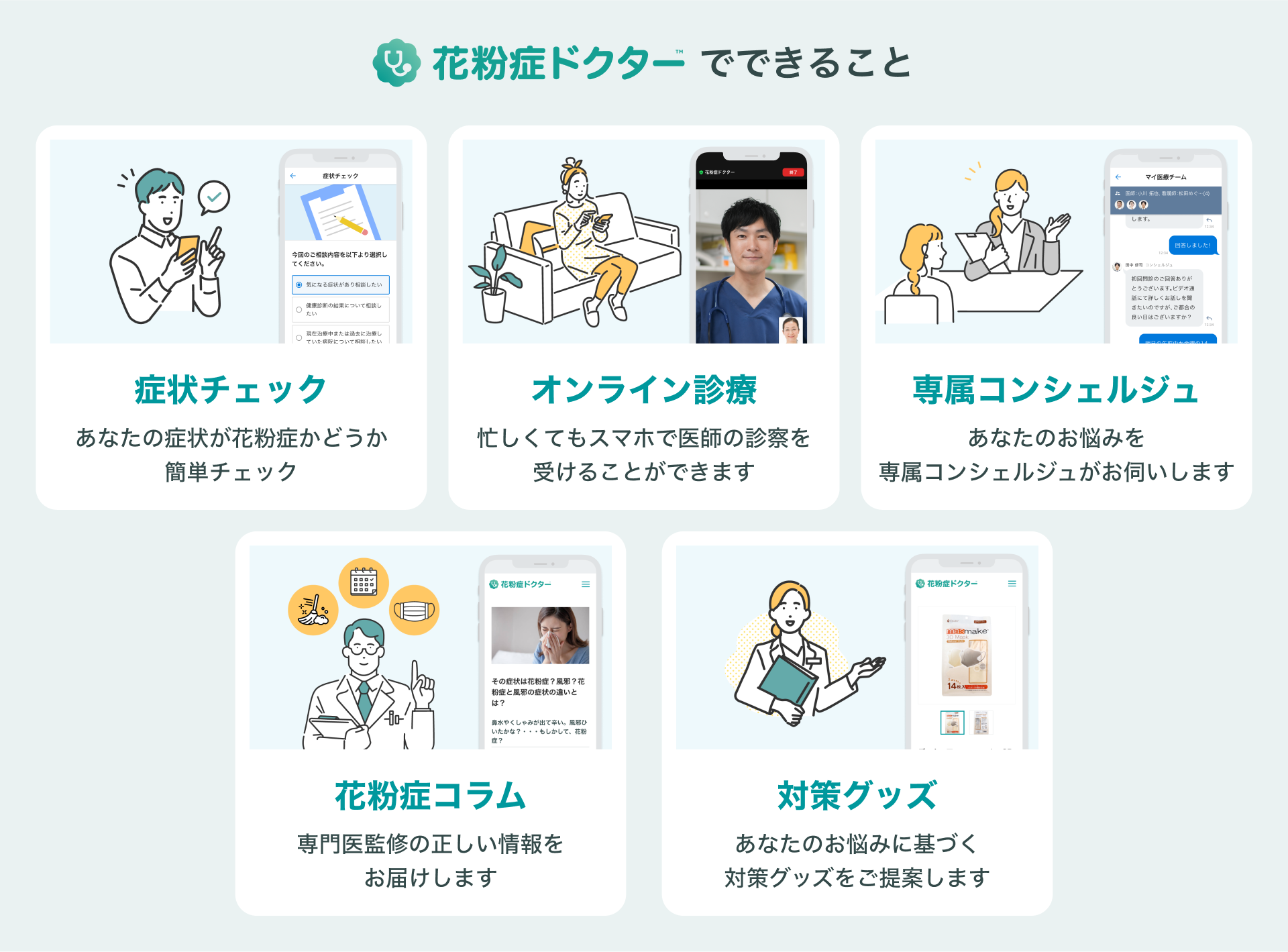 こうした花粉症ならではの背景や課題に対応すべく、花粉症への知識・経験を豊富に持つ専門医で構成された「花粉症対策チーム」を結成し、花粉症に関するお悩みをもつ方々が対策・治療に必要なアクションを適切なタイミングで行うことをサポートする、オンライン花粉症対策支援サービス「花粉症ドクター™」の提供を開始しました。