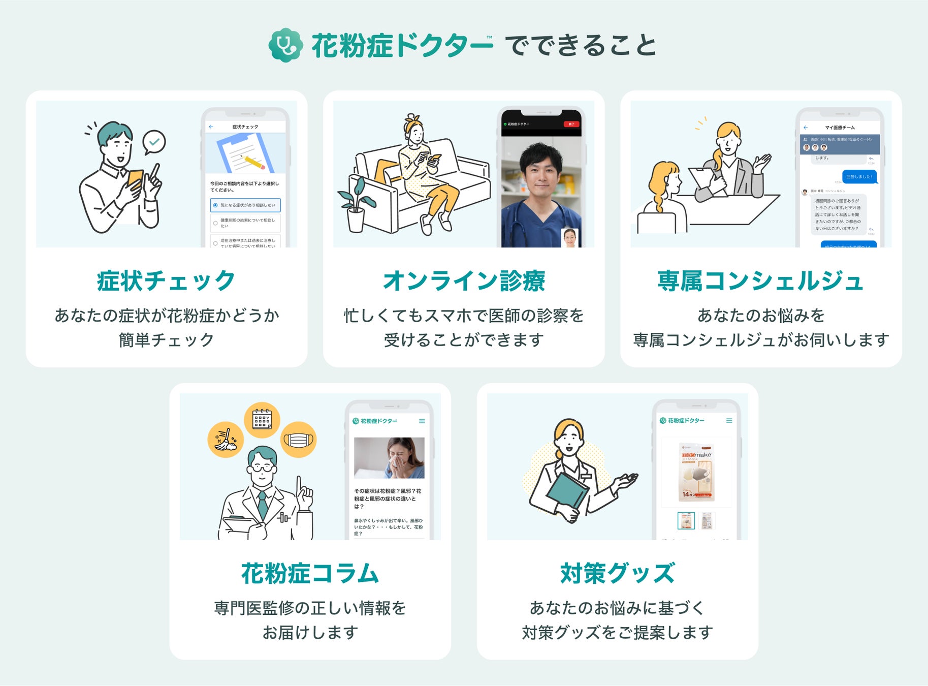 「花粉症ドクター™」は、症状のチェックからオンライン相談・診療、そして、アフターフォローまで全てオンラインで提供します。これにより、上記のような花粉症に関するお悩みを持つ方に対する、対策・治療の早期実施および継続をサポートします。
