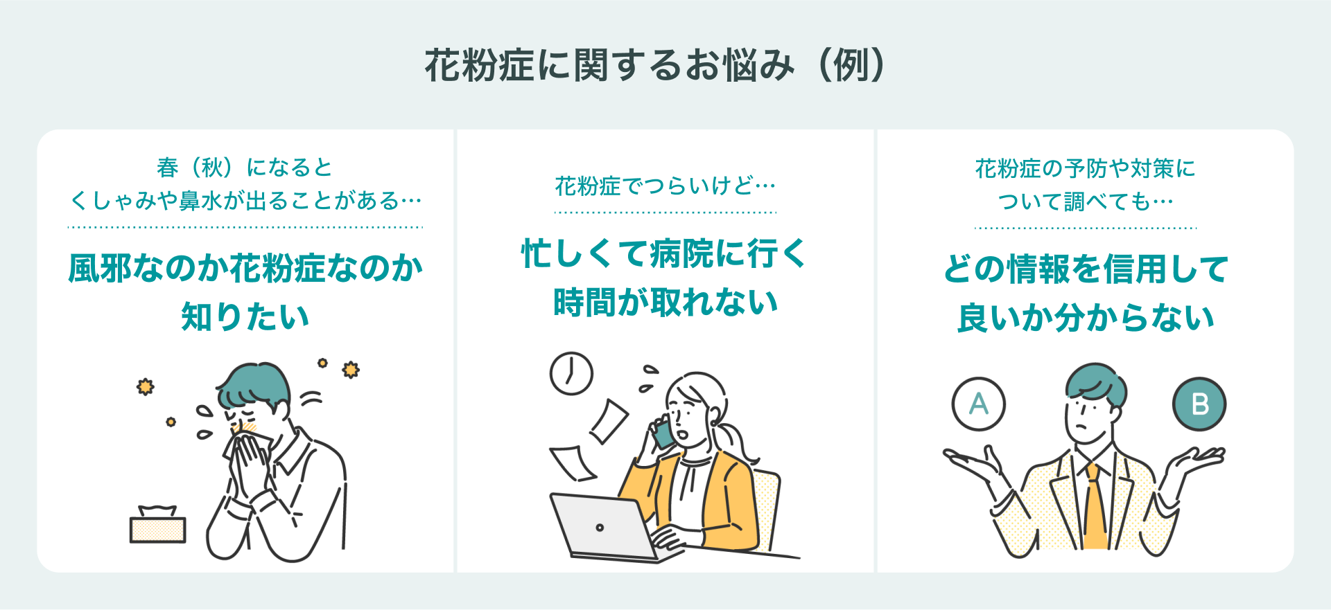 多くの方がその症状に悩まされ、今や「国民病」とも呼ばれている花粉症。その症状の辛さは集中力や判断力を低下させるなど、仕事や家事などの日常生活への影響も大きなものとなっています。一方、花粉症に関する悩みを持つ多くの方々からは、「忙しくて病院に行く時間が取れない」、「自分の症状が風邪なのか花粉症なのかよくわからない」という声もあり、自身の症状を踏まえた対策・治療の機会を十分に確保できず、症状を重症化させてしまうことも想定されます。