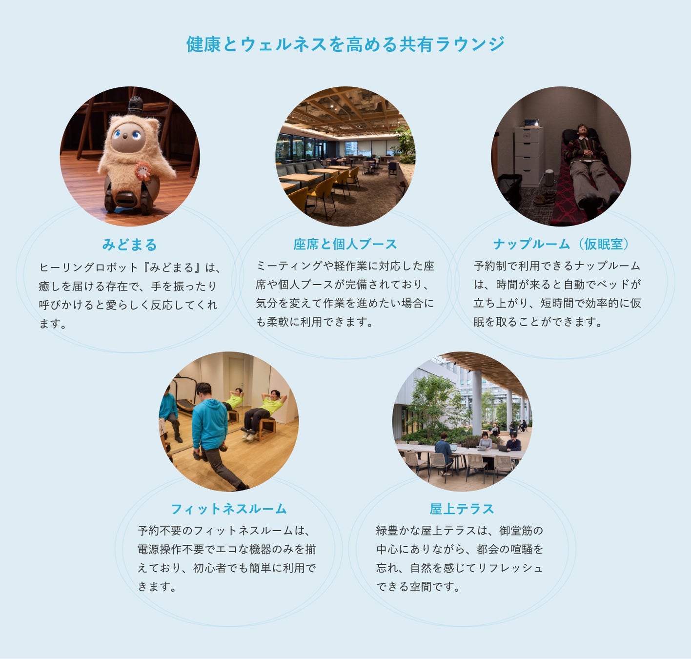 働く人の快適さと働きやすさ、ウェルビーイングを大切にした各エリアを紹介します。