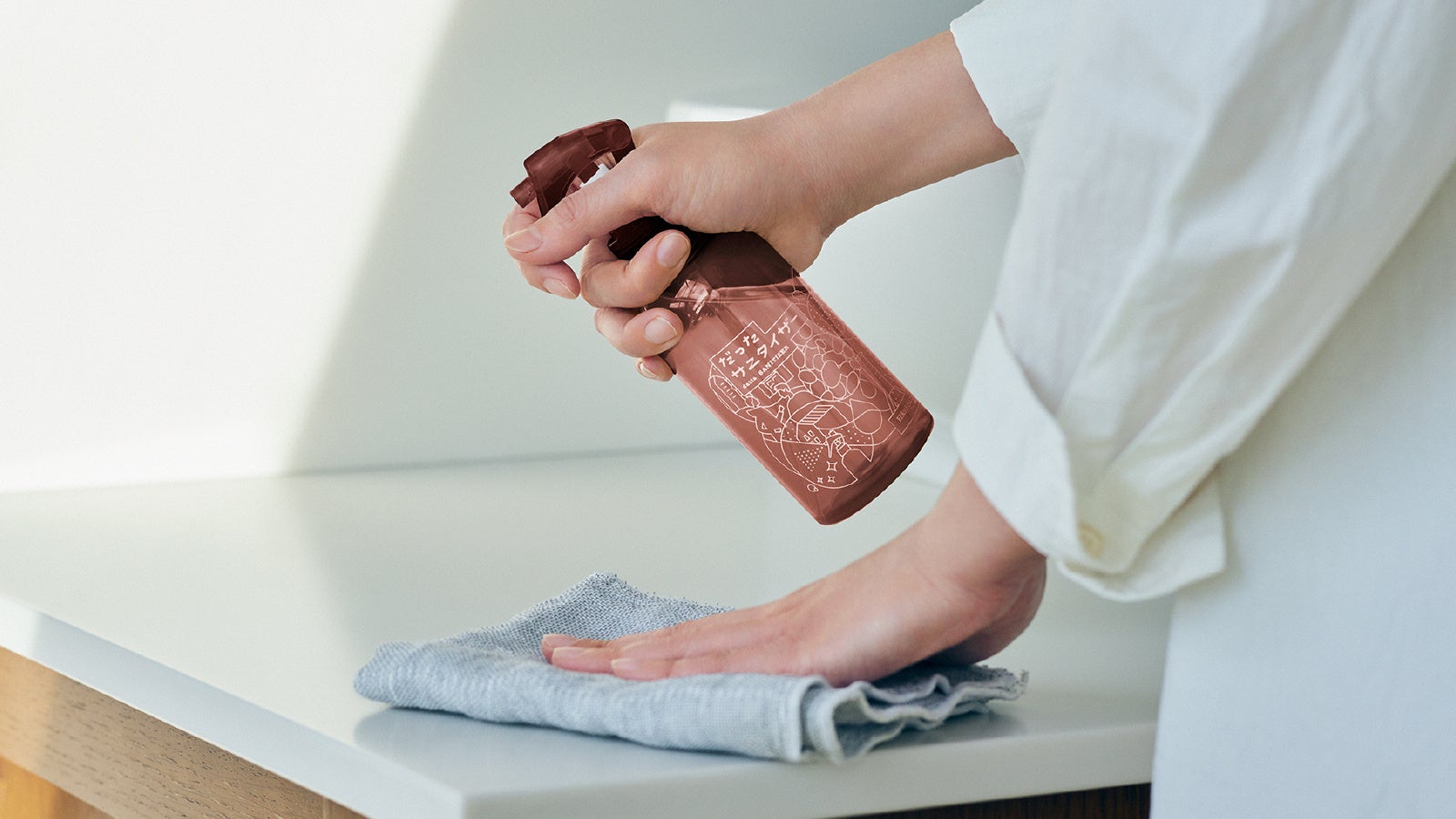 「シュッ」と吹きかけると、さわやかなりんごの香りが広がります。「香料」は一切使用せず、原材料のりんご自体からの香りを抽出しているのはファーメンステーションの独自技術によるものです。香料だけでなく、その他の添加物も一切不使用。エタノールと水だけでできたサニタイザーは、キッチン周り、子どものおもちゃ、ペット用品など、様々な場面の除菌に安心して使っていただくことができます。