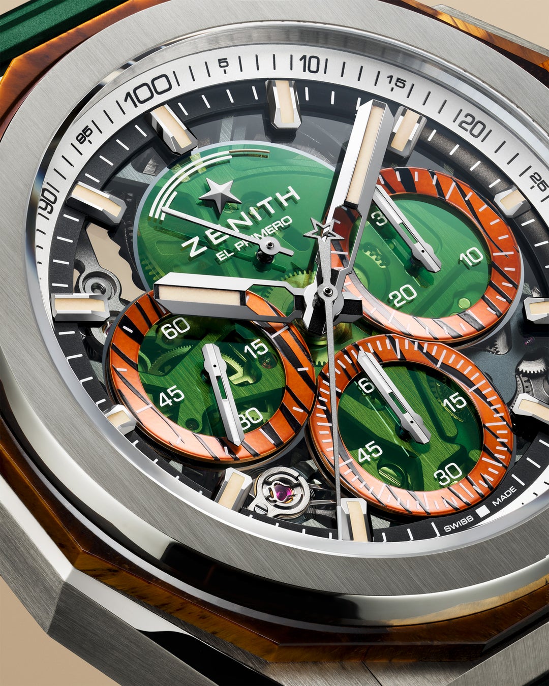 オープンなサファイア文字盤からは時計の複雑なメカニズムを眺めることができます。ジャングルというテーマを表現した文字盤はグリーンで彩られ、カウンターには虎の縞模様をさりげなく模したディテールが施されています。マーカーと針にはカラーリングを引き立てるベージュの夜光塗料が塗布され、あらゆる環境下での視認性を高めます。