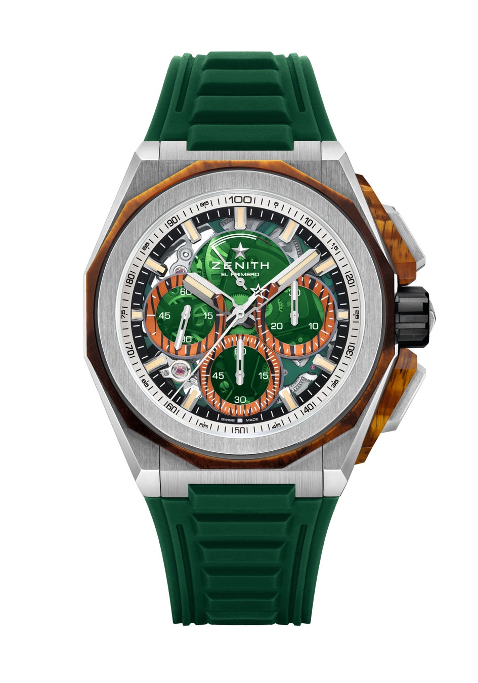 「デファイ エクストリーム」の堅牢な精神を携えながら、ゼニスは再び自然が支配する未知の領域にインスピレーションを求めました。荒野の奥地でも、“コンクリートジャングル”の中でも、過酷な環境に立ち向かえるよう設計された「デファイ エクストリーム ジャングル」は最高の堅牢性を誇る1/100秒計測のクロノグラフに天然石を使用した、想像をかき立てる3つのスペシャルエディションの最後を飾ります。複雑なケース構造にエキゾチックなジェムストーンを組み込む手法は、創造性と熟練の技術の融合であり、高性能を約束するタイムピースに独特の魅力をもたらしています。