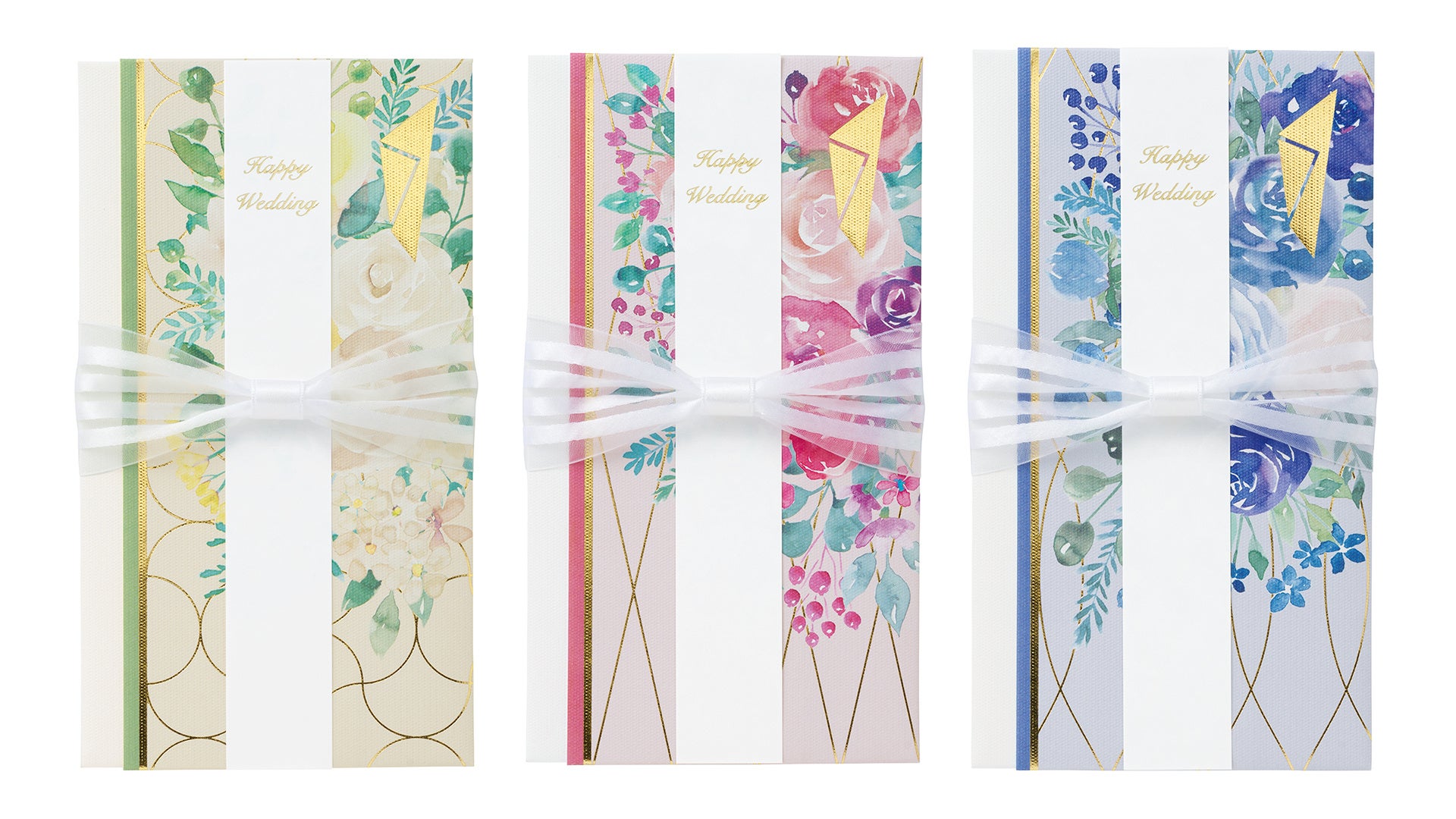 価格:638円(税込)/種類:3種(ホワイト・ピンク・ブルー)/製品寸法:100×180mm/内容:本体1枚、短冊2枚(Happy Wedding・壽)、中袋1枚/製品紹介ページ:https://paper.maruai.co.jp/shop/c/c01039923