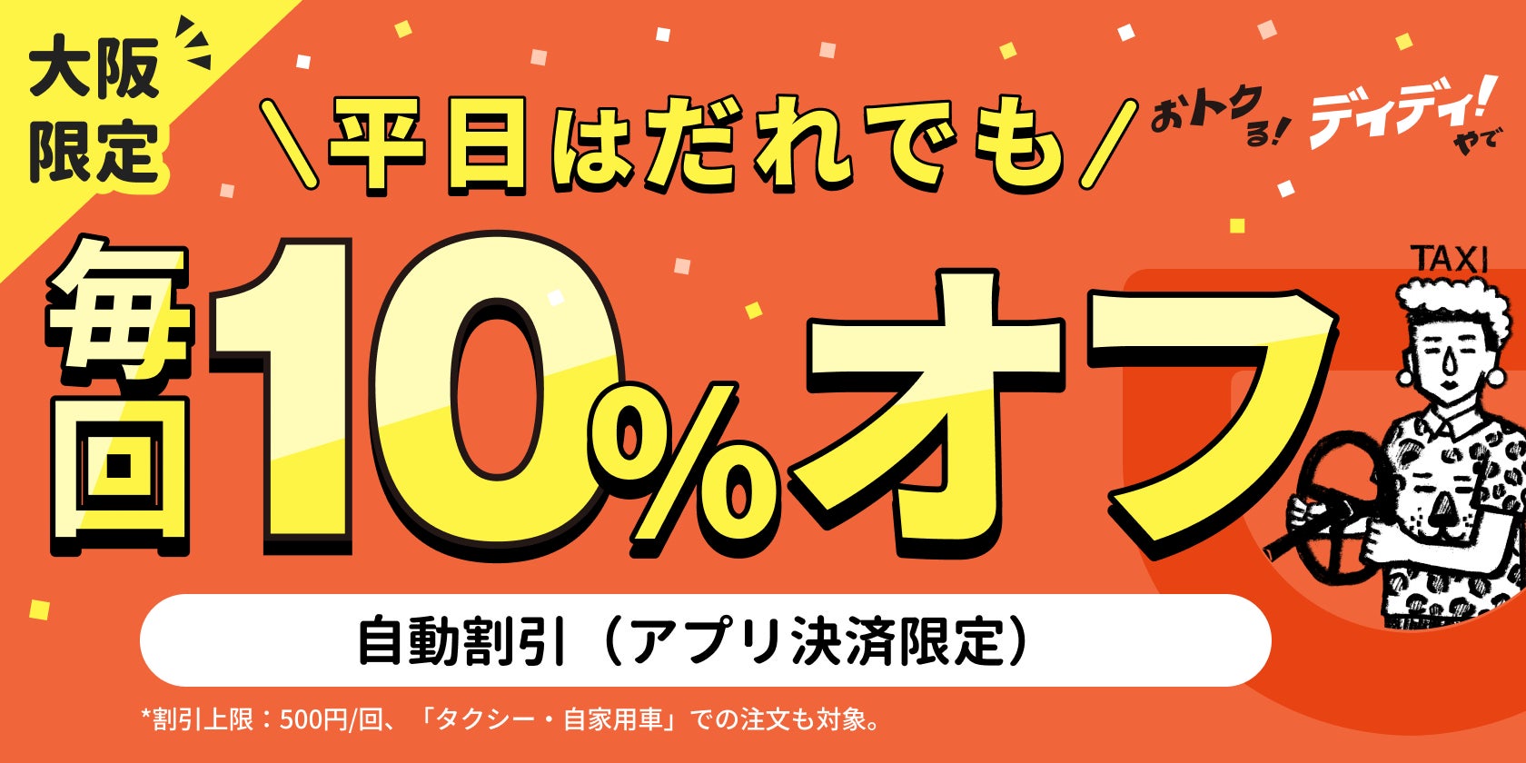 DiDiモビリティジャパン株式会社(本社:東京都港区、代表取締役社長:和久山 大輔、以下「ディディ」)は、2024年7月17日(水)より、大阪エリアにおいて「おトクる!ディディ!やで」キャンペーンの第二弾として、全ての利用者を対象に、大阪での乗車料金が平日(月〜金曜)は最大10%オフになるキャンペーンを開始します。2024年8月1日よりアプリ決済での乗車完了で自動適用されます。(*2024年8月1日追記)