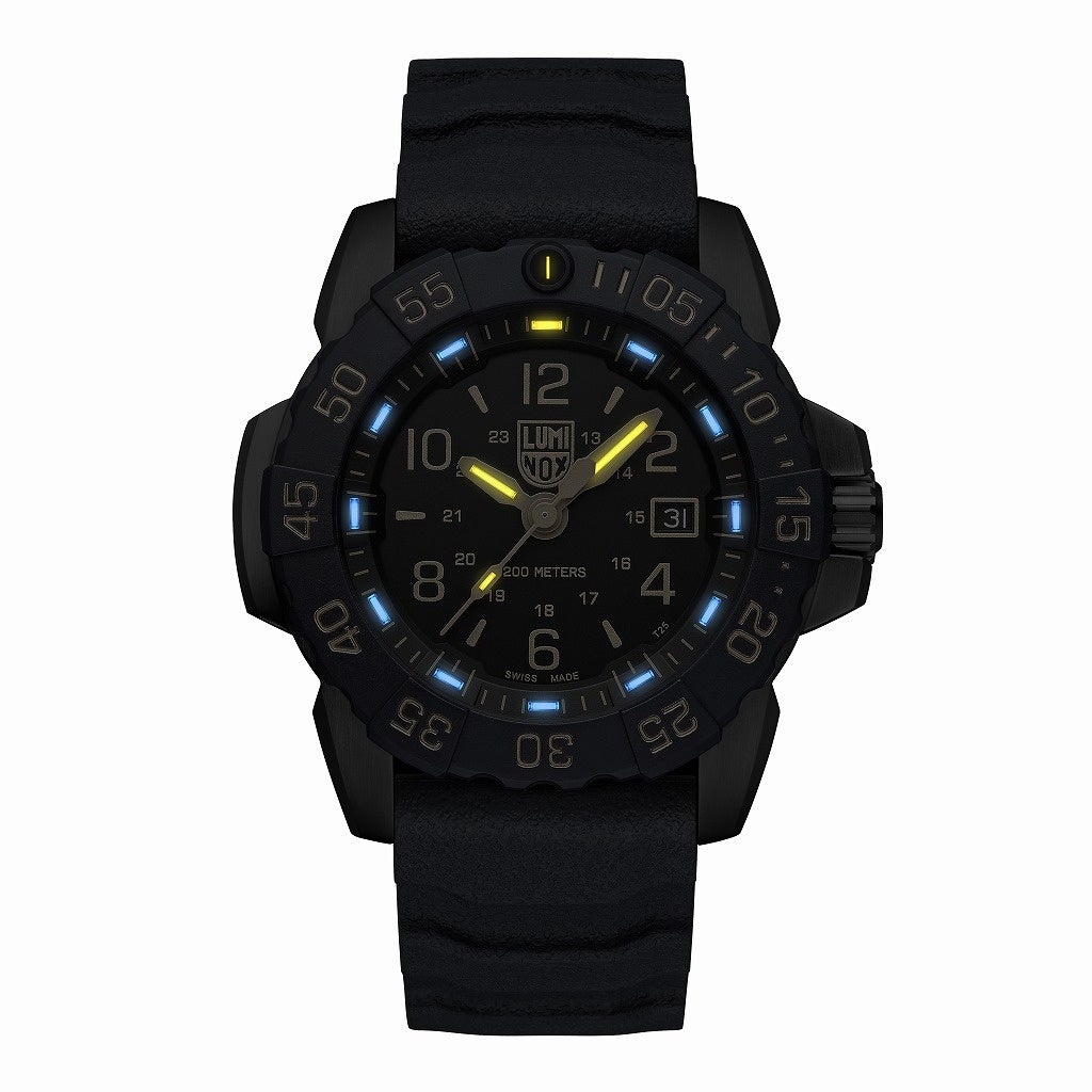 汎用性と耐久性を重視して設計され、特徴的なネイビーのストラップ、200M防水性と16本の自己発光システム【ルミノックス・ライト・テクノロジー(LLT)】により、あらゆる暗闇の環境化でも活躍できるよう優れた戦術的機能を搭載。