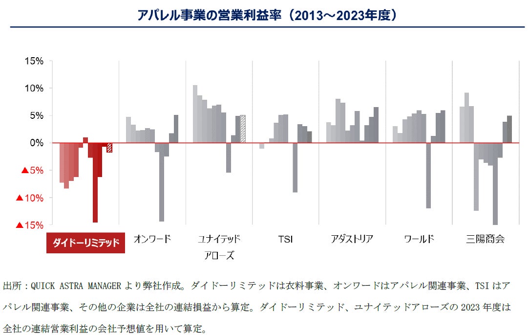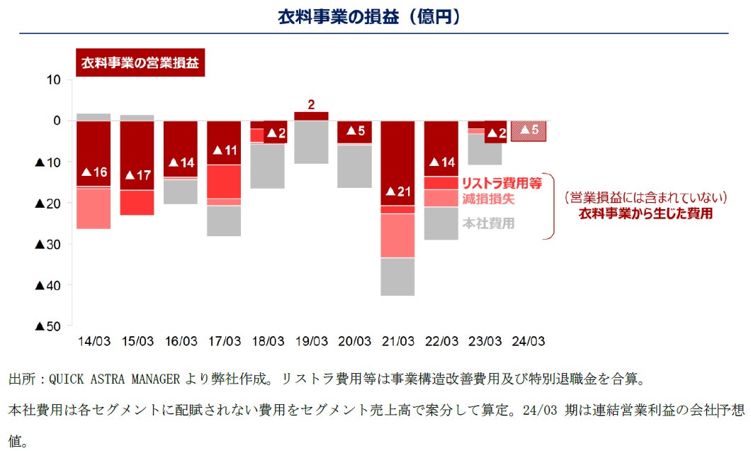 当社の本業である衣料事業は、過去10年間のうち、2019年3月期を除き全て営業損益が赤字となっており、累計で99.1億円の営業損失が発生しています。