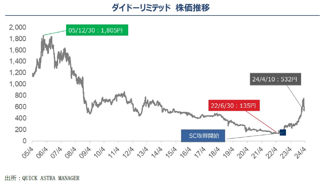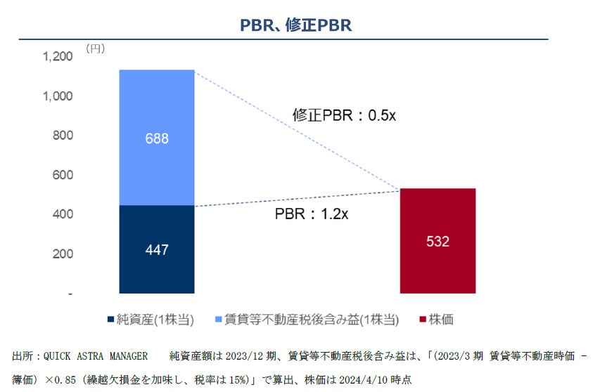 結果として、当社の株価は2006年以降、右肩下がりに下落し、2022年には10分の1以下の株価となりました。提案株主が買い始めた後は株価が上昇していますが、未だに賃貸等不動産の時価評価を加味すると解散価値を大きく下回っています。