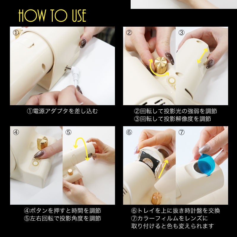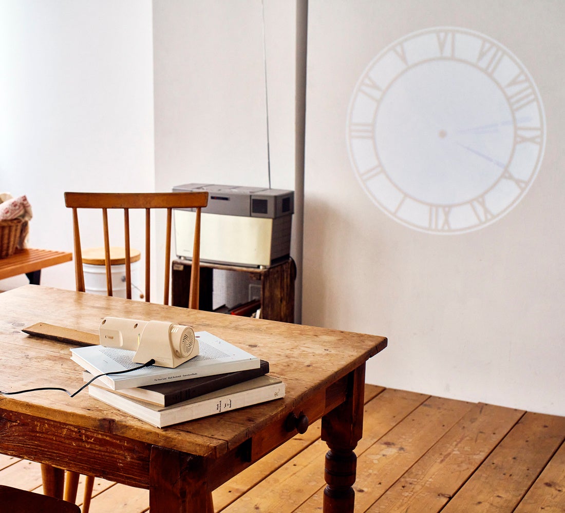 フィルムをセットし、レンズの向きや焦点を合わせれば、壁や床などさまざまな場所に時計を投影できます。