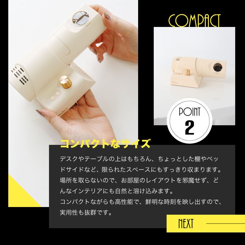 壁や天井など、お好きな場所に時刻を投影できるプロジェクター式時計。コンパクトでレトロなデザインは、お部屋のインテリアにも馴染みます。