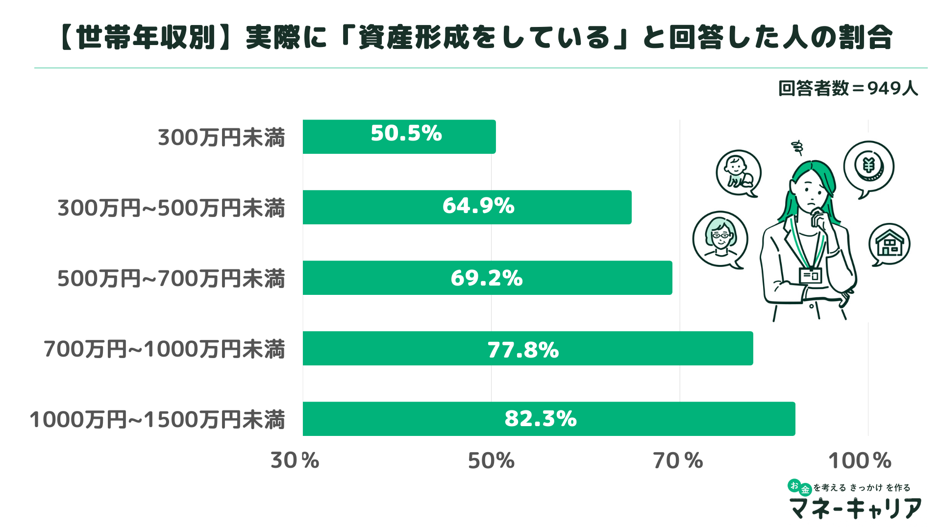 「資産形成を実際にしている」割合に関しては、年収300万円未満が50.5%に対し、年収1000万円以上は82.3%で31.8ポイント差と、非常に大きな差が出ました。