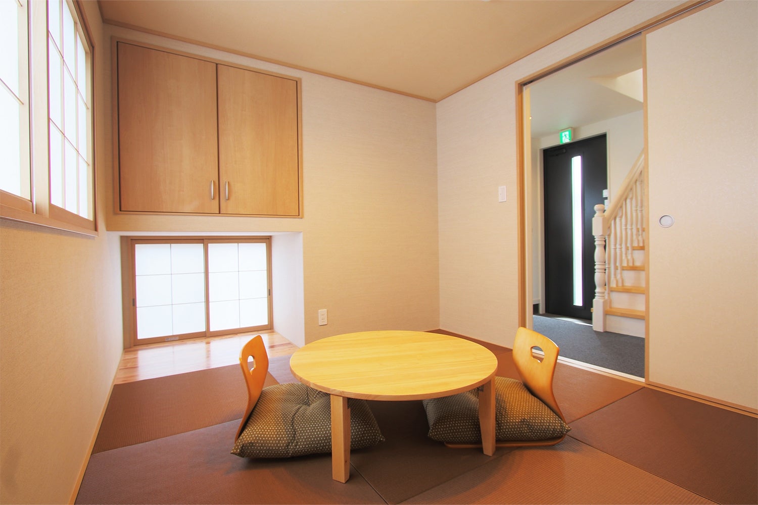 1棟貸切で利用できる全3棟の和風ヴィラは2階建て定員8名と贅沢なゆとりある間取り。