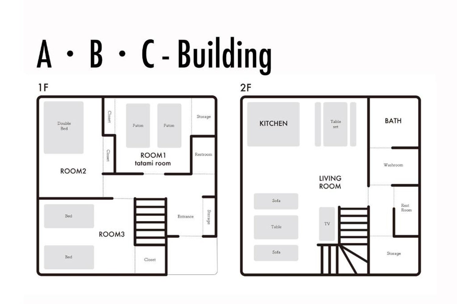 ヴィラス和楽は全3棟。いずれも間取り共通、一棟貸切のヴィラタイプ。蔵のような外観のゲストハウスは、1階に2つのベッドルームと和室スペース、2階はオープンキッチン付きのリビングダイニングルームを設けております。気兼ねなく別荘感覚でご滞在頂ける大空間で、最大定員大人8名とご家族はもちろん大人数のグループ旅行の利用にも最適です。