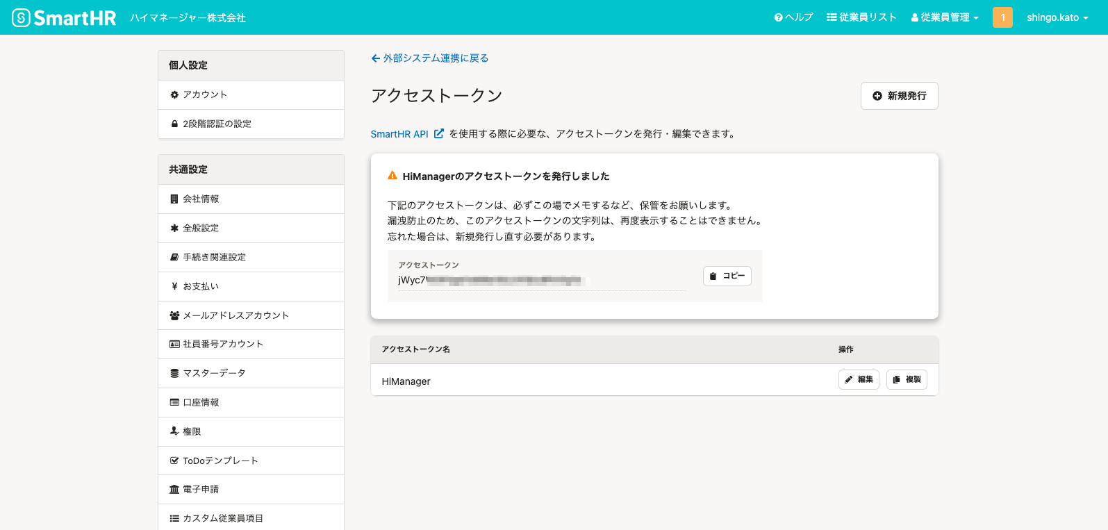 SmartHRのテナントIDと発行されたアクセストークンをHiManagerの設定画面にて登録します。