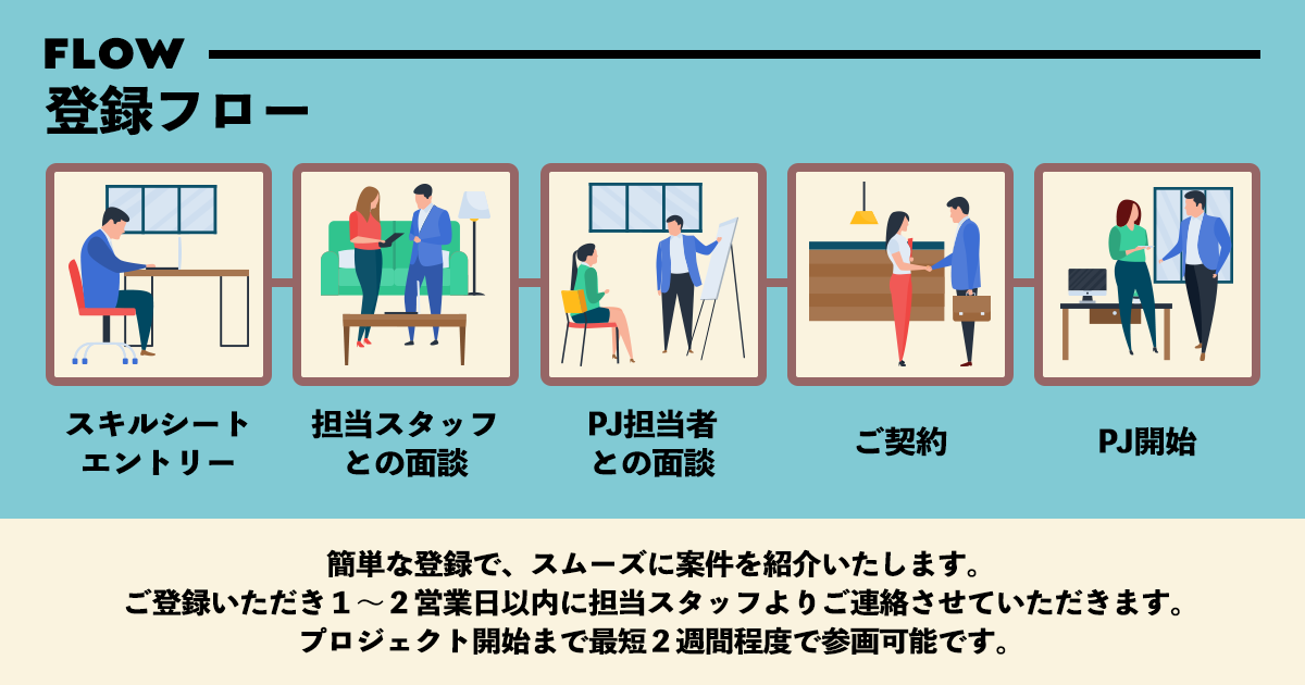 また、現在稼働中のエンジニアさんがJOB STAND登録からプロジェクト参画までどのような経緯を経たか、スケジュールイメージを紹介するページを今月中に追加予定。