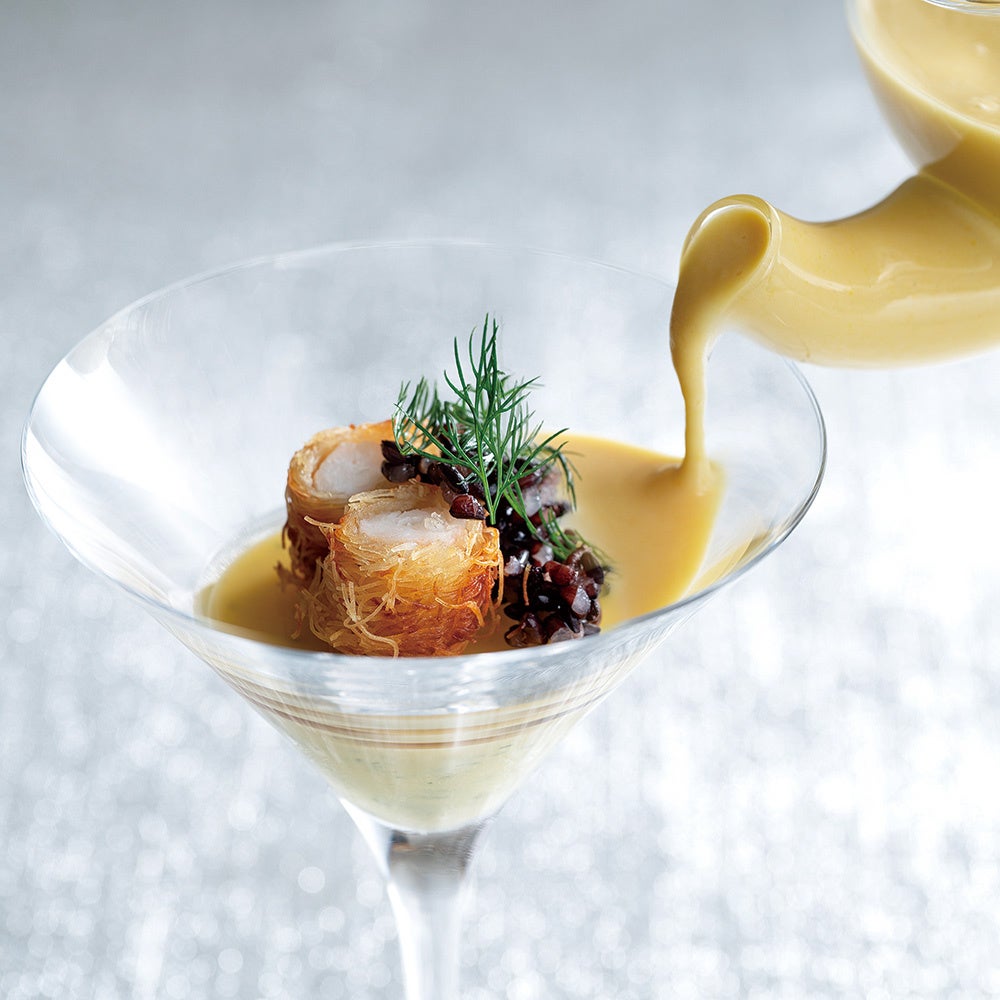 ・玉蜀黍の冷製スープ 手長海老のカダイフ包み添え ディルの香り