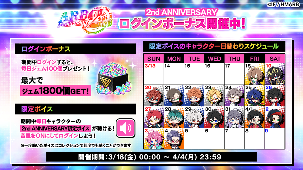 期間中、ログインすることで毎日100個ジェムを獲得できるログインボーナスを実施中です。また、ログイン時にはキャラクターの2nd ANNIVERSARY限定ボイスを聴くことができます。限定ボイスは日替わりとなっていますので、どうぞお聴きのがしなく。