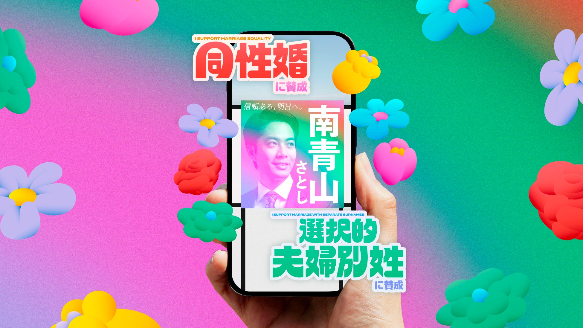 日本は、G7で唯一*「同性婚」と「夫婦別姓」が法律で認められていない国として知られています。「選択的夫婦別姓」については、今年5月に28年ぶりとなる法案が提出され、国会で審議されたものの結論が出せず、秋の臨時国会での継続審議となりました。また「同性婚」については、これまでに5度にわたり高等裁判所で違憲判決が出て注目されているものの、政府および国会はいまだに具体的な動きを示していません。こうした法整備の遅れが国内だけでなく諸外国からも指摘される中、法制化の早期実現を目指すマリフォーとあすにはの両団体は、来月20日に行われる第27回参議院議員通常選挙に向けて初めて共同での取り組みの検討を開始。有権者にとって生活の中の最も身近な場所にある候補者選びの場である「街頭の選挙ポスター」に着目し、ポスターにスマートフォンをかざすだけで、同性婚と選択的夫婦別姓の法制化について賛成している候補者がわかるARカメラを開発しました。(*イタリアはパートナシップ法を国が制定)