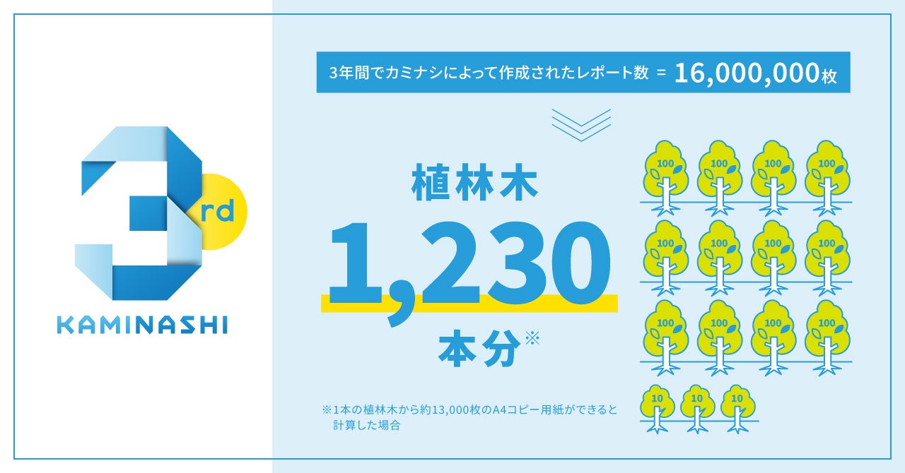 『カミナシ』はプロダクト名のとおり、これまで食品や製造、飲食、宿泊、物流などの7,000以上の現場に溢れている非効率な紙をなくしてきました。1つの帳票(レポート)につきA4コピー用紙1枚と換算すると、2020年のサービス開始からこれまでの3年間で削減した紙の枚数はのべ1,600万枚にのぼり、植林木にすると1,230本にあたります。(※2)
