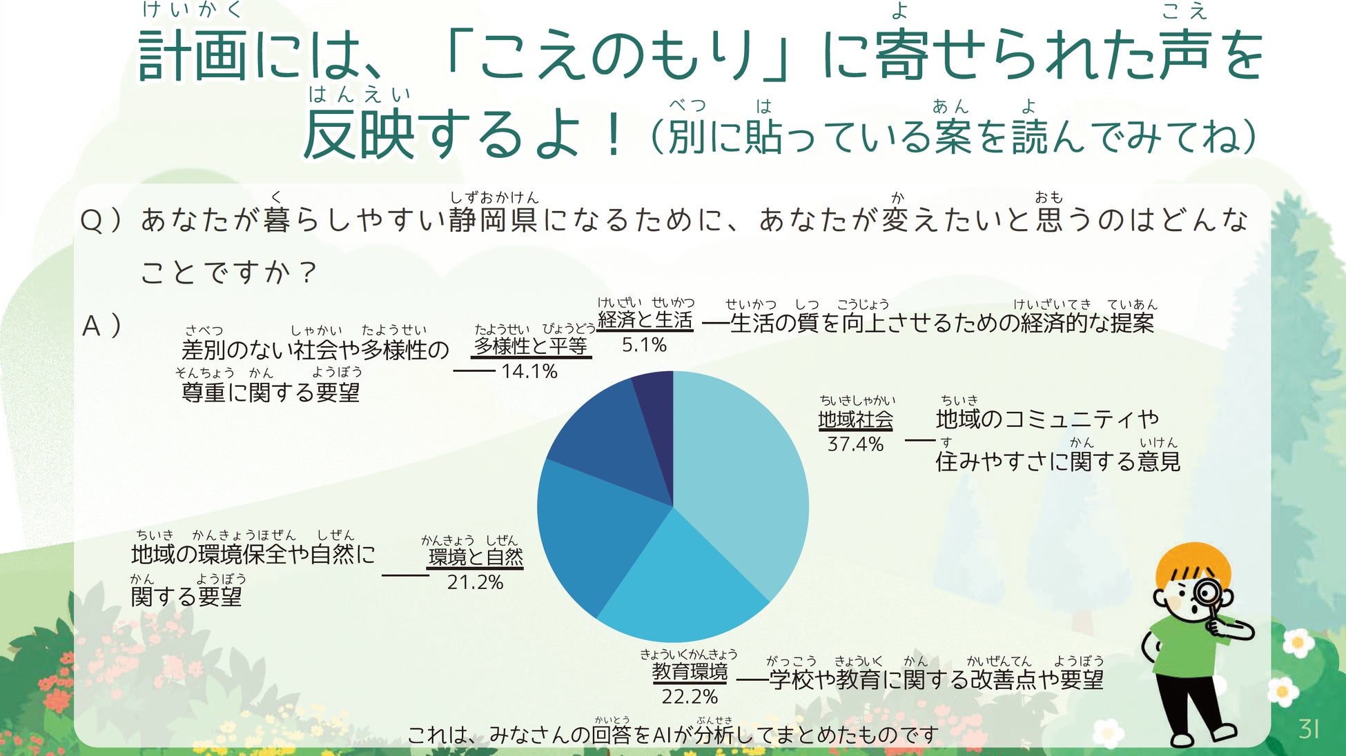 概要:静岡県は、こども基本法等に基づくこども意見表明の仕組みとして、令和6年度よりLiqlidを活用して、オンラインプラットフォーム「こえのもりしずおか」を構築。「こえのもりしずおか」で収集されたこども・若者意見を本機能で分析し、「こえのもりしずおか」上でフィードバック資料として公開。