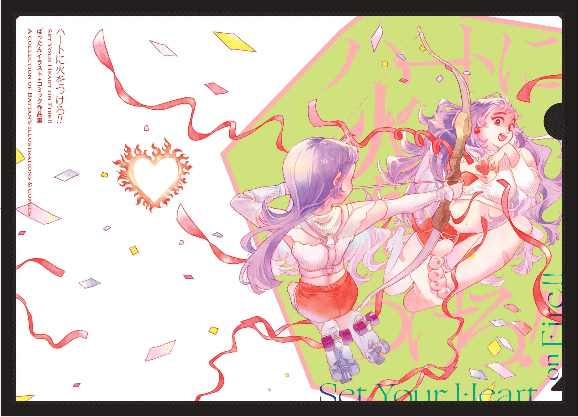 作品集『ハートに火をつけろ!!』の描きおろしカバー絵をプリントしたクリアファイル。表面から裏面にかけて、フルカラーで絵柄が続く豪華仕様。裏面中央のハートの部分だけ中が透けて見える、遊び心のあるデザインです。