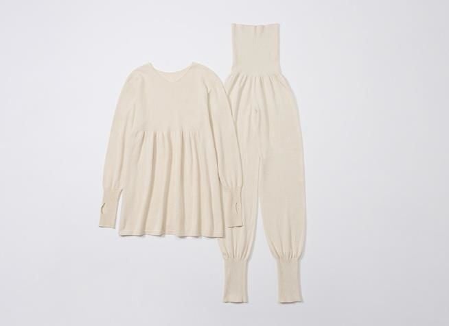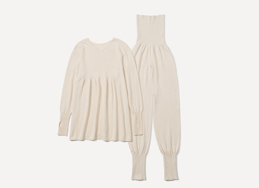 Vネックのギャザープルオーバーにネックウォーマーを合わせ、足先もすっぽり覆えるパンツとセットにしました。枕カバーとしてお使いいただけるオーガニックコットンの袋入りです