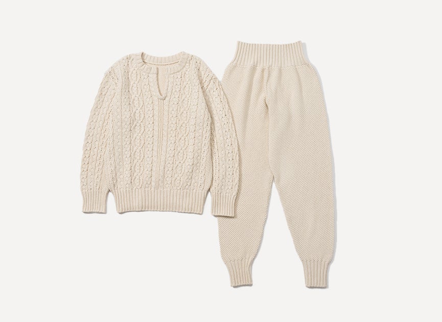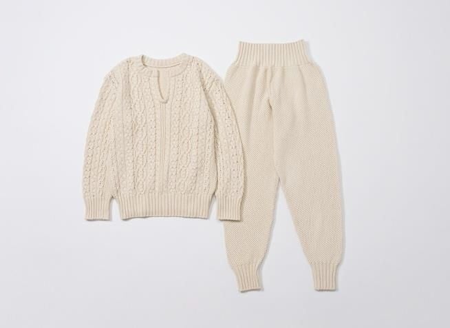 ケーブル編みと鹿の子編みを組み合わせたキーネックのセーターに、鹿の子編みのニットパンツを合わせ、このセット限定のナップサックに入れました。