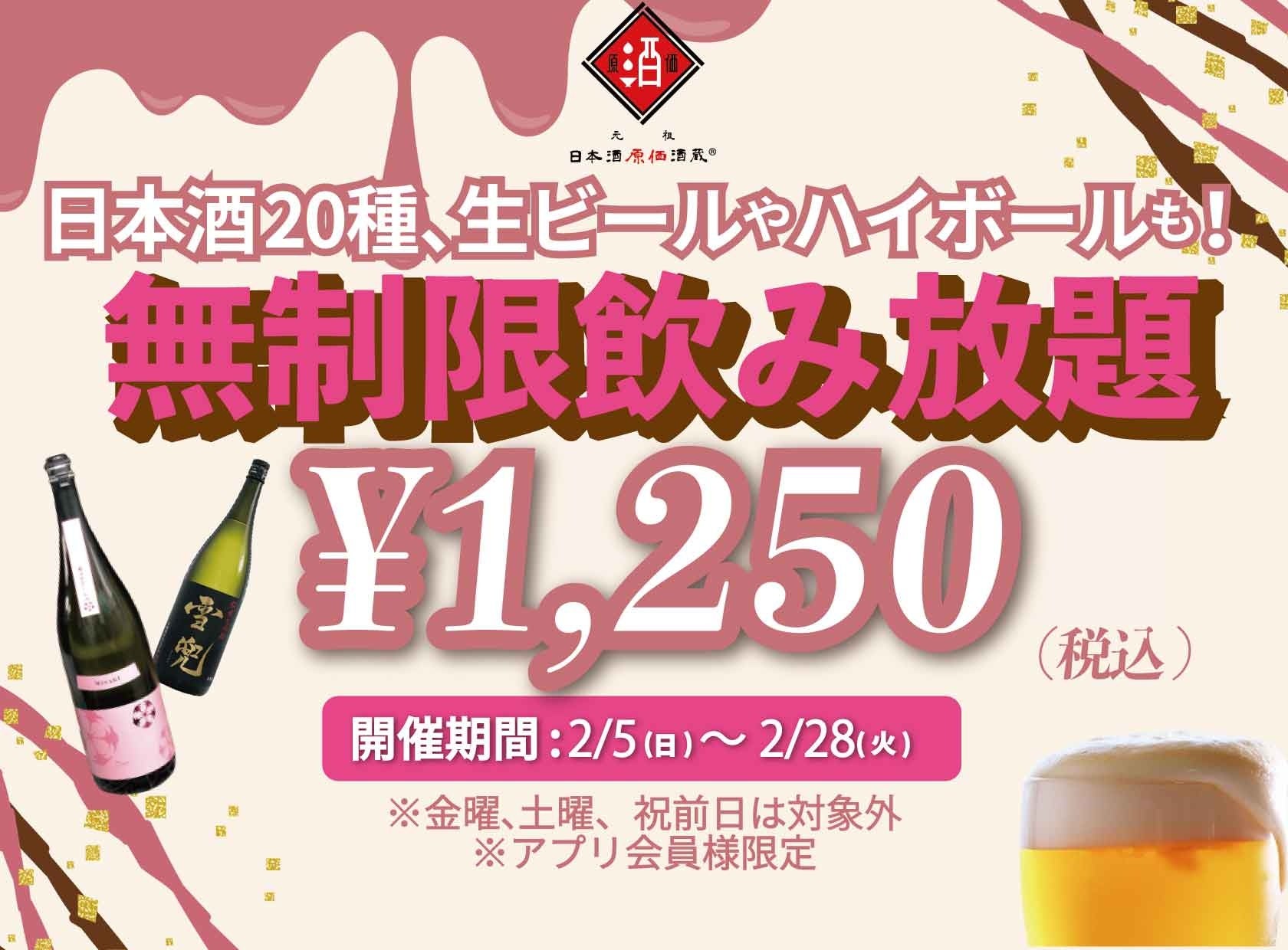 2月5日(日)~2月28日(火)に日本酒原価酒蔵全店にて時間無制限飲み放題¥1,250(税込)を開催します。